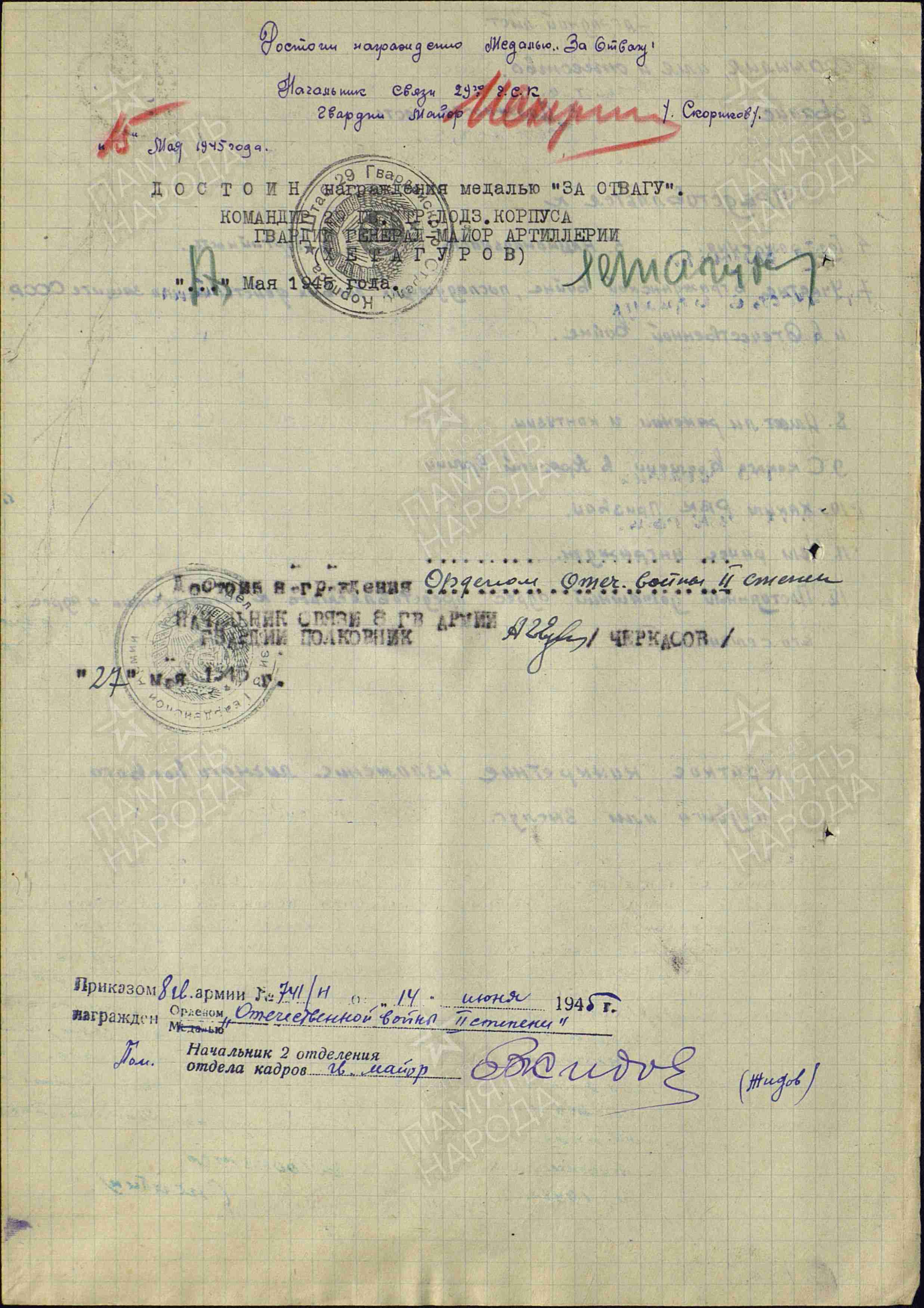 Призван 08.1941г. Ново-Письмянским РВК, ТАССР. Воинское звание: красноармеец. Воинская часть: 700 окшр 29 гв. ск 8 гв. А