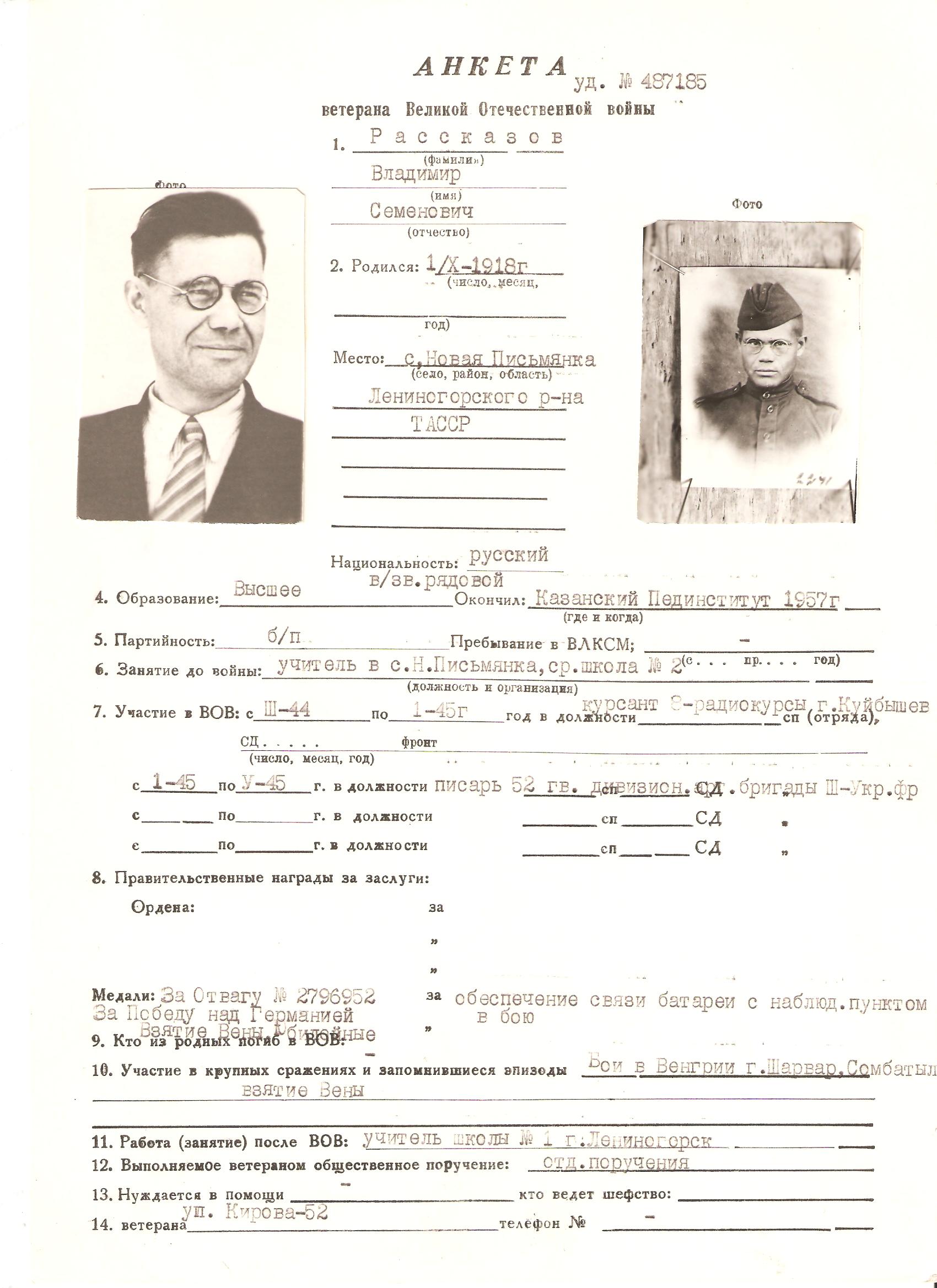 «… 14 марта 1944 года я был мобилизован в армию. Направили в город Куйбышев на 8-е радио курсы. Здесь готовились радисты. Занимались в классах- землянках, принимали азбуку Морзе на слух, работали на ключе. Здесь я пробыл 9 месяцев.
