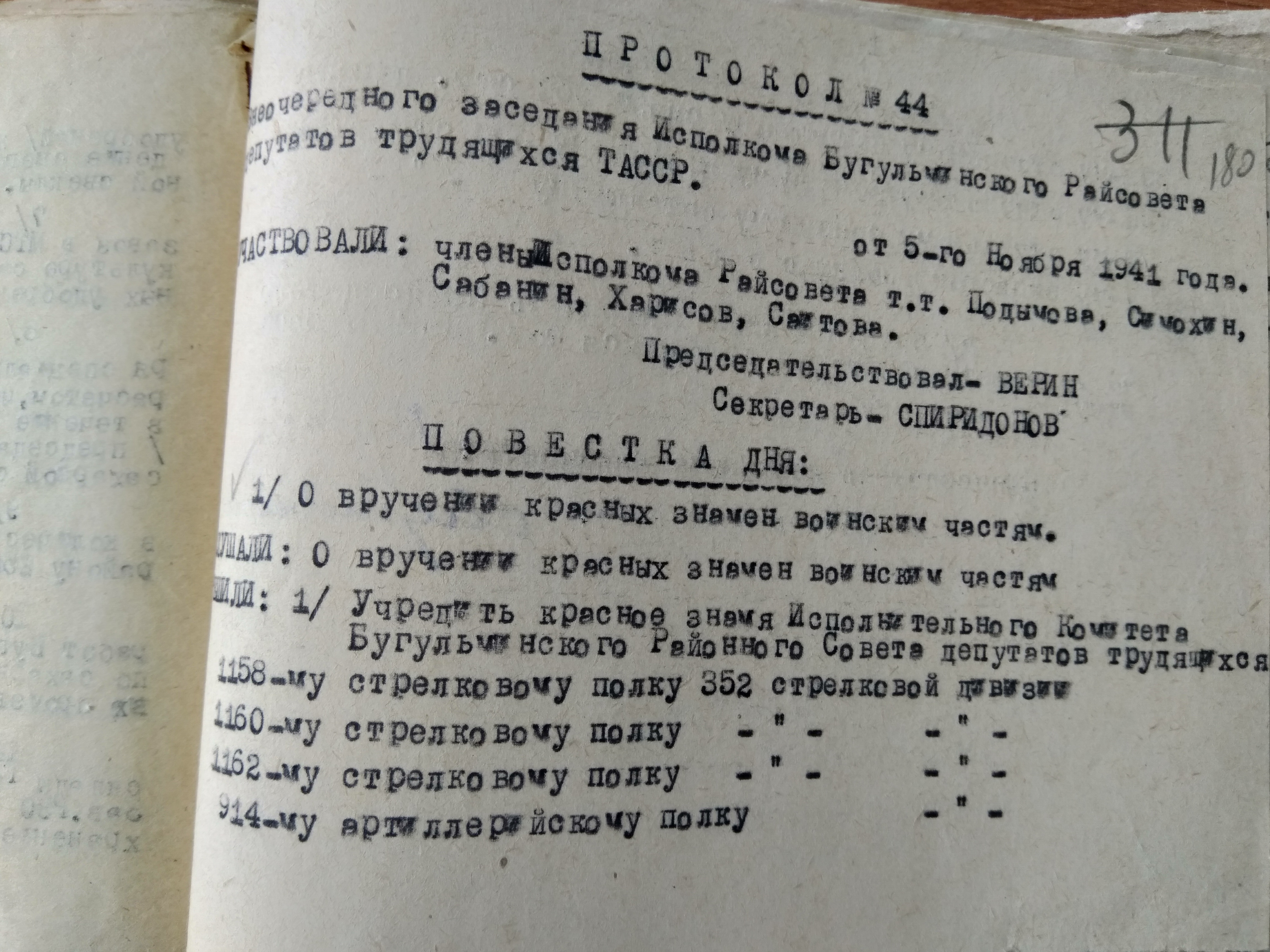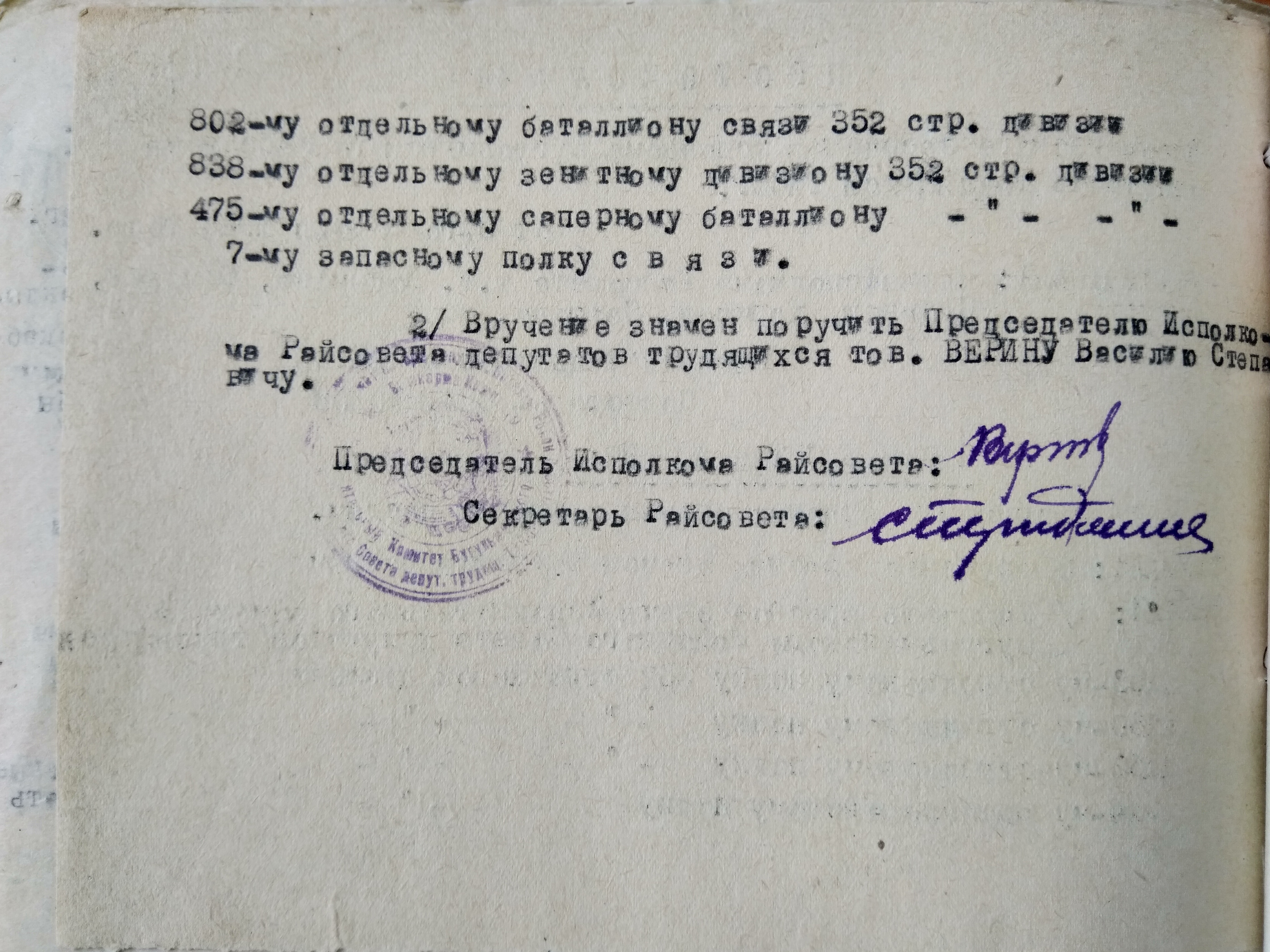 РЕШЕНИЕ ИСПОЛКОМА БУГУЛЬМИНСКОГО РАЙОННОГО СОВЕТА ДЕПУТАТОВ О ВРУЧЕНИИ КРАСНЫХ ЗНАМЁН ВОИНСКИМ ЧАСТЯМ 352 СТРЕЛКОВОЙ ДИВИЗИИ Район: БугульминскийПрикреплённые изображения: Архивы Опубликовано 12 мая, 2024 - 21:25 пользователем Дятлов Алексей