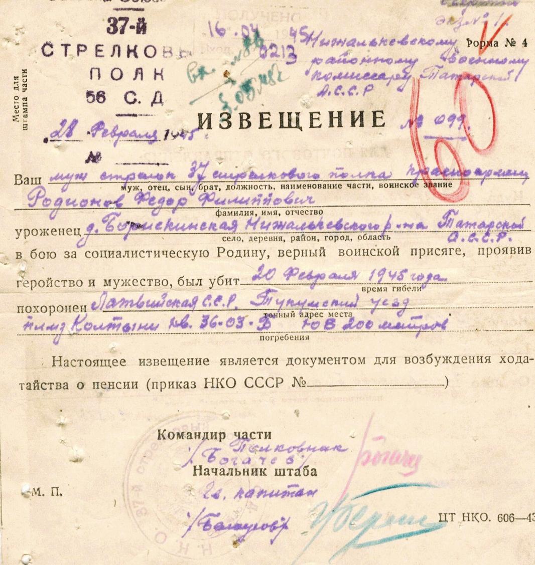 Убит 20 февраля 1945 года. Похоронен Латвийская ССР, Тукумский уезд, 36-03-Б, плмз. Колтыни, юго-восточнее, 200 м.