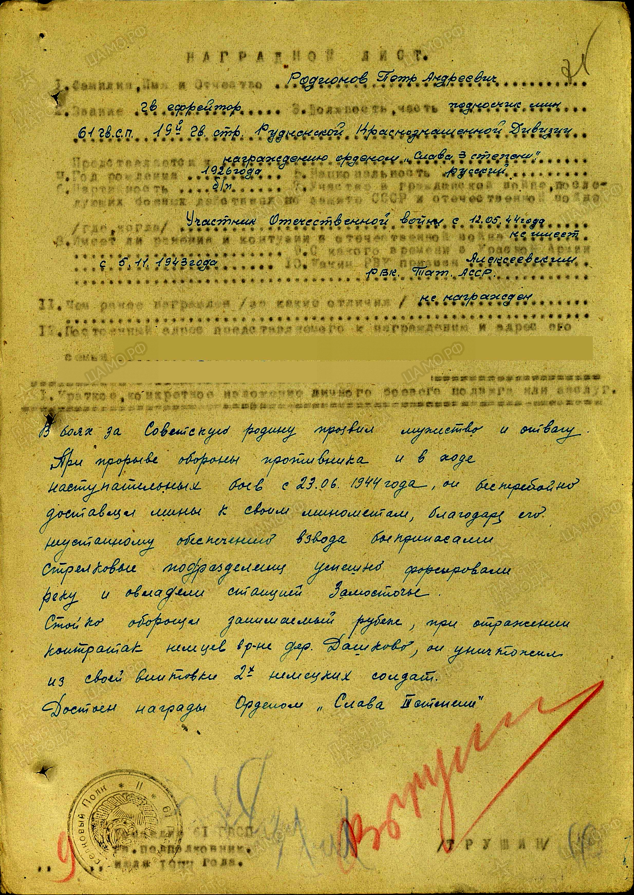 РОДИОНОВ Пётр Андреевич (Алексеевич), 1926, с. Ромодан. Мобилизован Алексеевским РВК 5 нояб. 1943. В действующей армии с 12 мая 1944. Гв. ефрейтор, миномётчик, подносчик мин 61 гв. СП 19 гв. СД 39 А 3 БелФ. В ходе прорыва обороны противника в районе Витебска и Орши, 23 июня 1944 бесперебойно снабжал боеприпасами свои миномёты и стрелков. При отражении контратак из своей винтовки убил двух немецких солдат. Награждён орденом Славы 3 ст. Погиб в бою 19 июля 1944 ЛитССР, Девяльтовская губ., Вилькомирский уезд, д. Мендеришки.