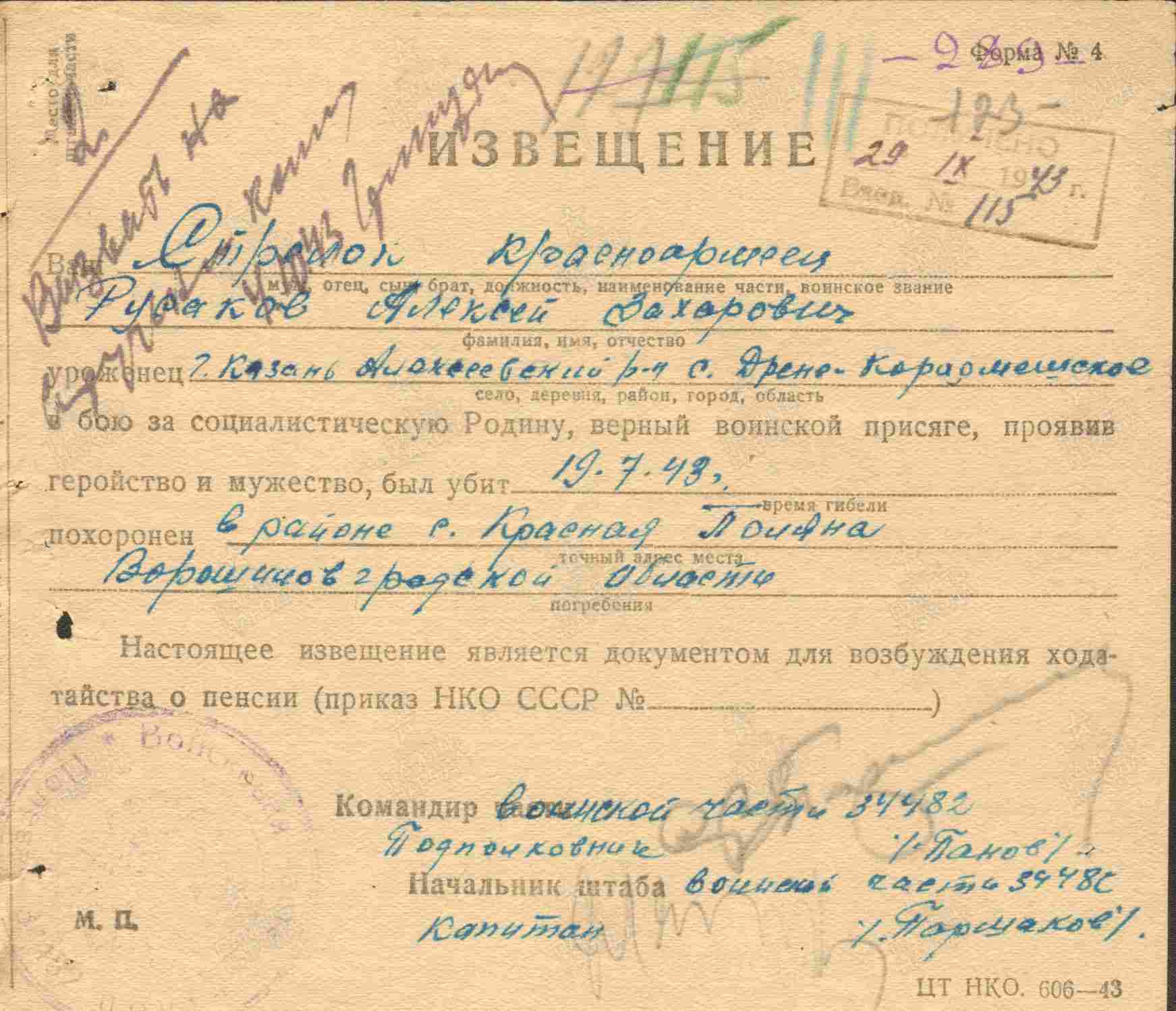 РУСАКОВ Алексей Захарович, 1897, с. Мокрые Курнали. До призыва в армию работал в к-зе «Маданият». Мобилизован в нояб. 1942 Алексеевским РВК. Красноармеец, 1379 СП 87 СД 51 А Южного фронта. Погиб 19 июля 1943, с. Красная (Червоная) Поляна, Антрацитовский р-н, Ворошиловградская (Луганская) обл., УкрССР.
