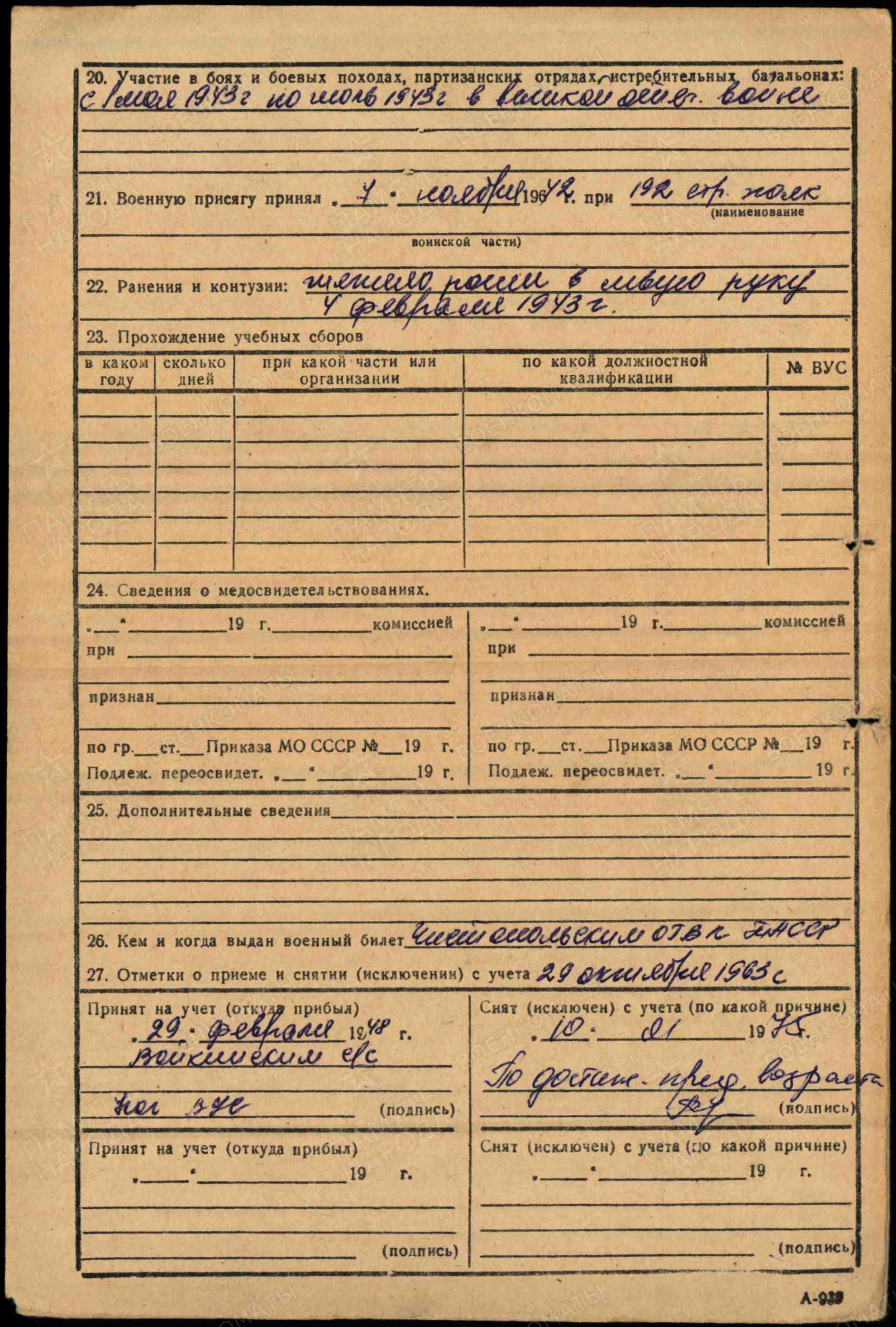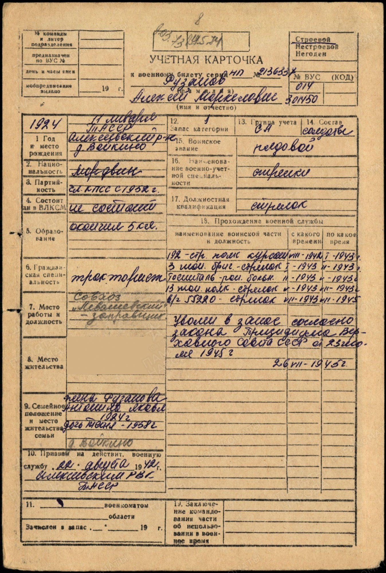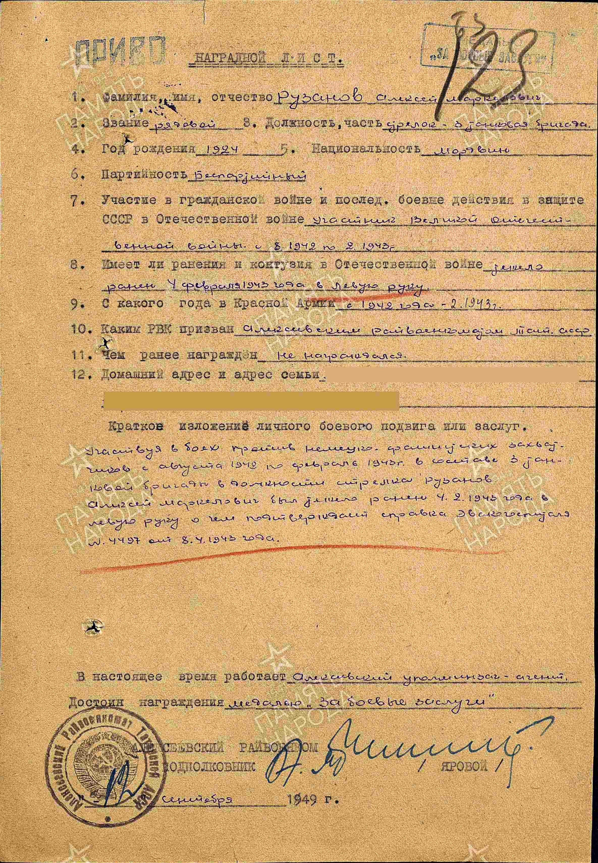 РУЗАНОВ Алексей Маркелович (Маркович), 1924, д. Войкино. До призыва в армию работал трактористом в к-зе «Красный борец». Мобилизован 22 авг. 1942 Алексеевским РВК. Красноармеец/ гв. красноармеец. С янв. 1943 воевал в составе 3 ТБр 23 ТК 3 гв. А Юго-Западного фронта. Тяжело ранен в левую руку 4 фев. 1943. Проходил лечение в ЭГ 4497, г. Казань. Повторно мобилизован 8 апр. 1943 Бауманским РВК. С июля 1943 воевал в составе 13 гв. ТБр 4 гв. ТК 27 А Воронежского фронта, автоматчик. Участник битвы на Курской дуге. Ошибочно учтён пропавшим без вести 18 авг. 1943, с. Михайловка, Лебединский р-н, Сумская обл., УкрССР. С янв. 1944 служил стрелком 4 запасного бронеполка 4 ББр. Демобилизован 26 июля 1945. После войны работал заправщиком в с-зе «Левашёвский». Награждён медалью «За боевые заслуги» (1951).