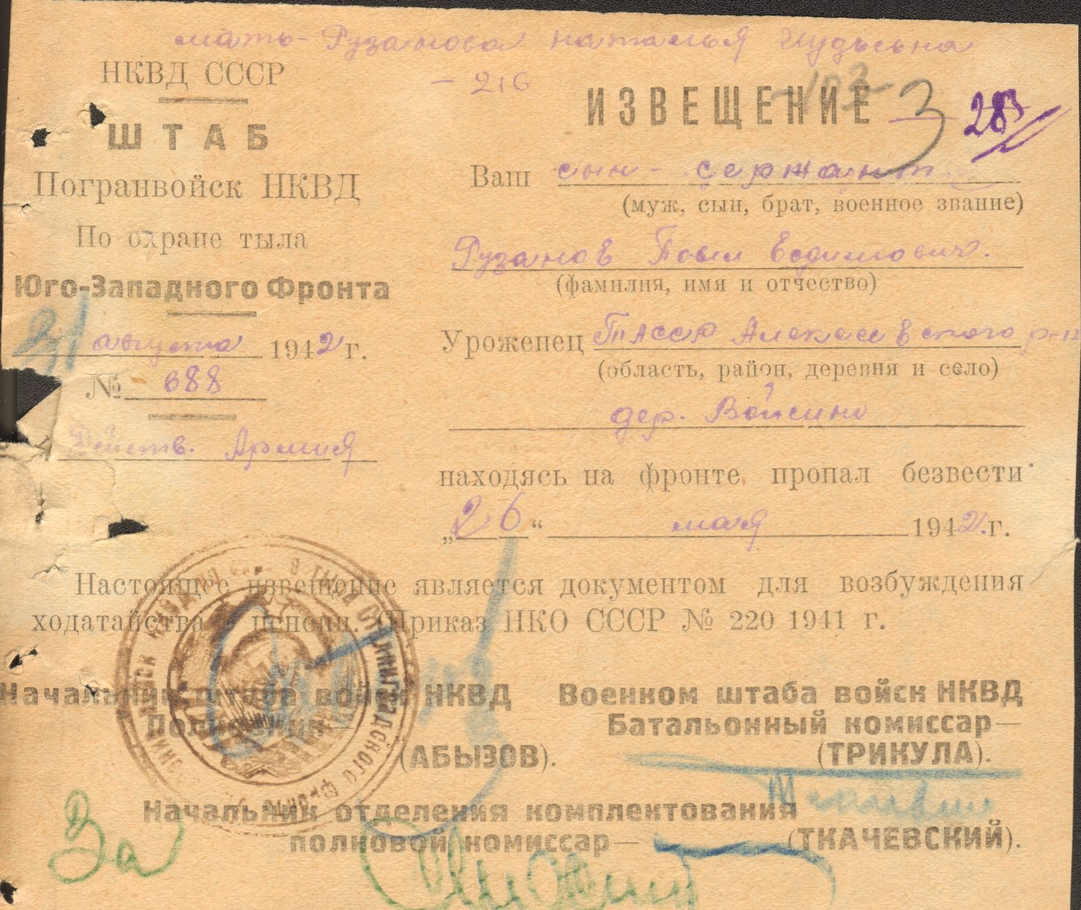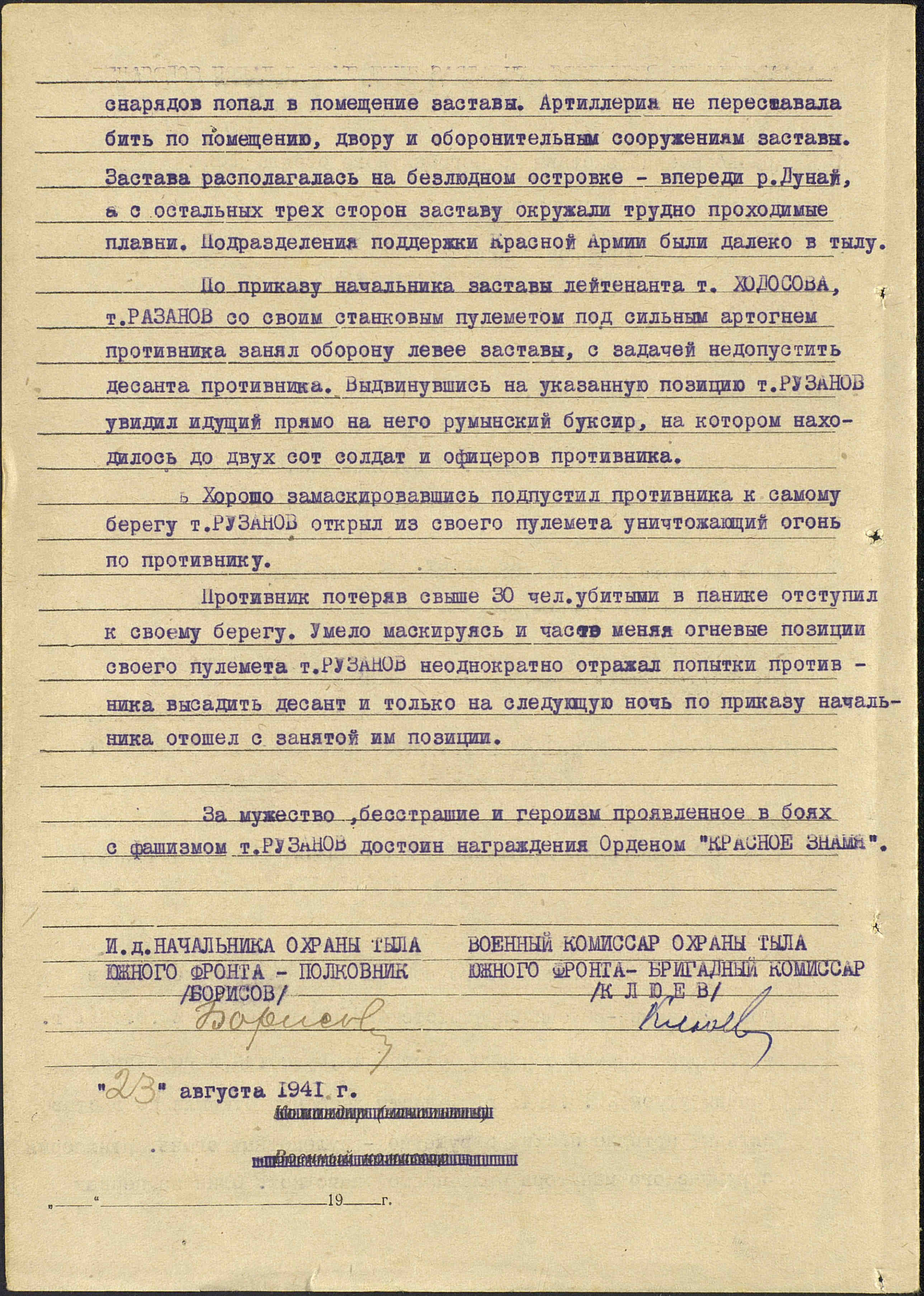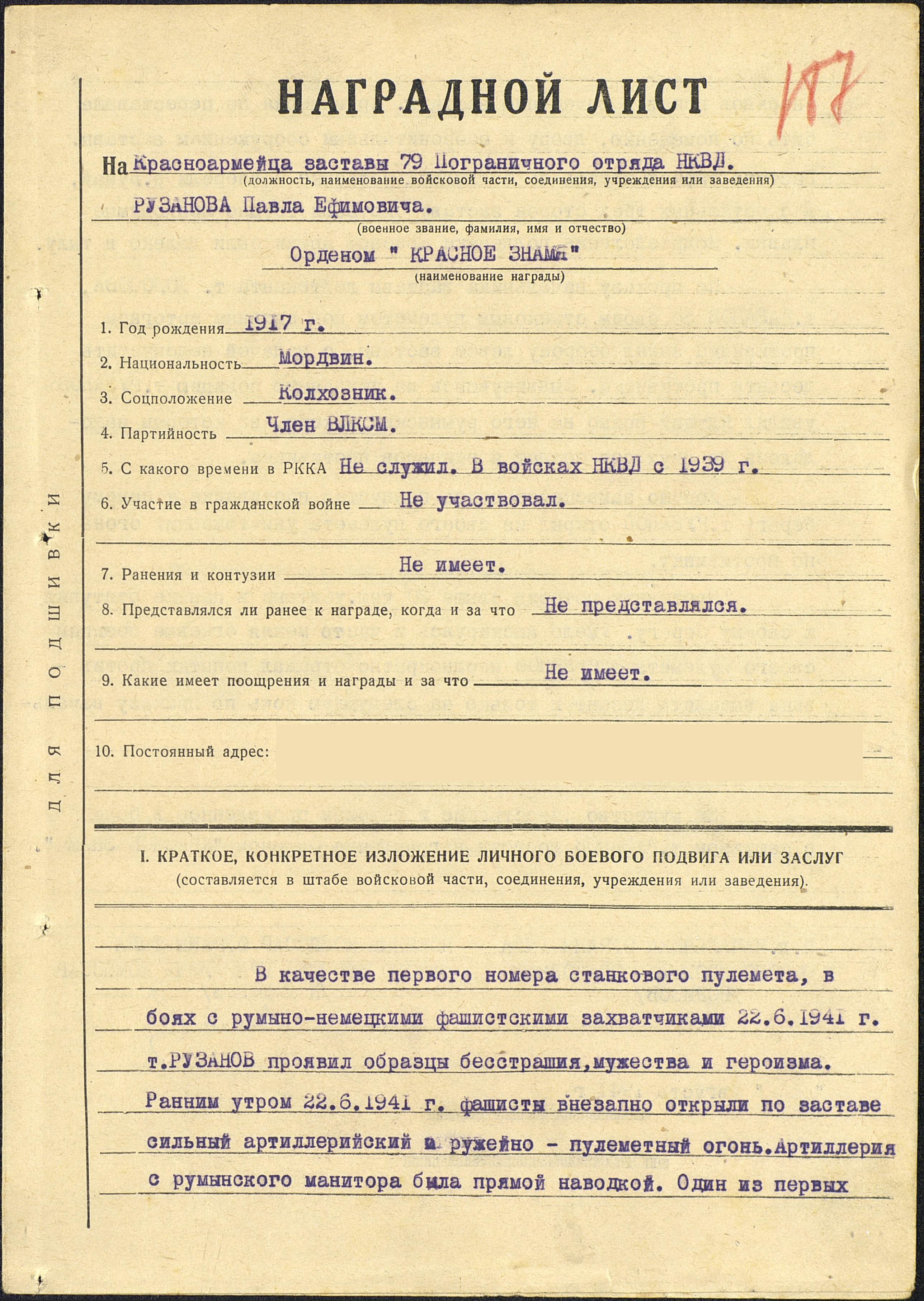 РУЗАНОВ Павел Ефимович, 1917, д. Войкино. Мобилизован Алексеевским РВК в 1939 г. Красноармеец 79 пограничного отряда погранвойск НКВД, пулемётчик, первый номер станкового пулемёта. Член ВЛКСМ, мордвин, колхозник. 22 июня 1941 г., находясь на одной из пограничных застав на реке Дунай, её личный состав принял ранним утром бой с румынско-немецкими захватчиками. Красноармеец Рузанов по приказу командира занял позицию левее заставы и огнём своего пулемёта, умело маскируясь и меняя огневые точки, в течение всего дня не допускал высадки вражеского десанта на наш берег. При этом противник потерял до 30 человек убитыми и ранеными. Свою огневую позицию и заставу пограничники организованно оставили только следующей ночью по приказу своего командования. В дальнейшем П.Е. Рузанов воевал в составе войск охраны тыла Южного фронта. В августе 1941 г. за мужество и отвагу в первый день войны на границе СССР был награждён орденом Красного Знамени. Красноармеец Рузанов погиб (пропал без вести) в конце мая 1942 г. во время Харьковского окружения.