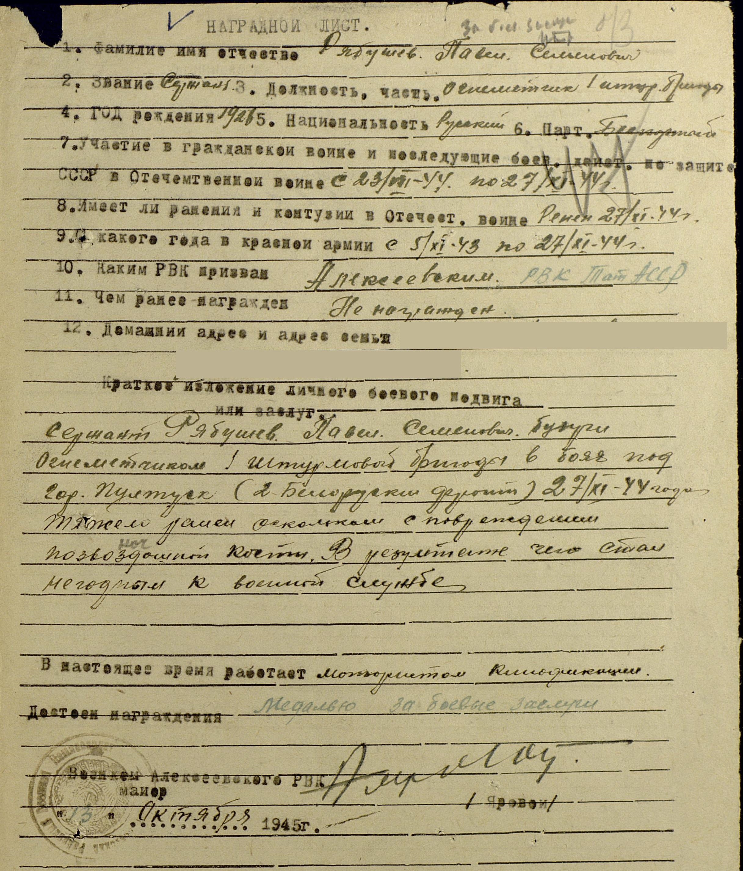 РЯБЫШЕВ Павел Семёнович, 1926, с. Алексеевское. До призыва в армию работал в Алексеевской районной конторе связи. Член ВЛКСМ. Мобилизован Алексеевским РВК 5 нояб. 1943. В боях с лета 1944 на 2 Белорусском фронте в составе 50 А/ 48 А. Участник освобождения Белоруссии и Польши. Сержант, ком. отделения огнемётчиков 34 отд. БРО 1 гв. ШИСБр. 27 нояб. 1944 тяжело ранен осколком с повреждением позвоночной кости. После госпиталя демобилизован по ранению. Работал мотористом отдела кинофикации, в дельнейшем жил в г. Казань. Награждён медалью "За боевые заслуги", орденом Отечественной войны 2 ст. (1985). Умер в 2004.