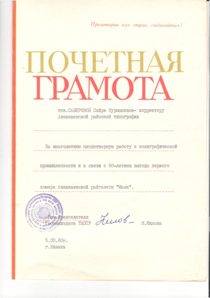 В 1944 году с завода по состоянию здоровья отозвали отца. Он приехал совсем больной. В 1945 году мать родила еще сына. А вскоре похоронили отца. Так осталась с детьми малограмотная женщина. «Маме чтобы нас прокормить, надо было наниматься на самую тяжелую работу. Мешки таскала, в поле работала. Соседи маму жалели и помогали, но все равно было очень трудно. Помню, мама рассказывала, что нас ей предлагали отдать в детдом. Она, конечно, отказалась. Мы ей всегда очень благодарны за все» - всплакнула Сайра Курмашевна.