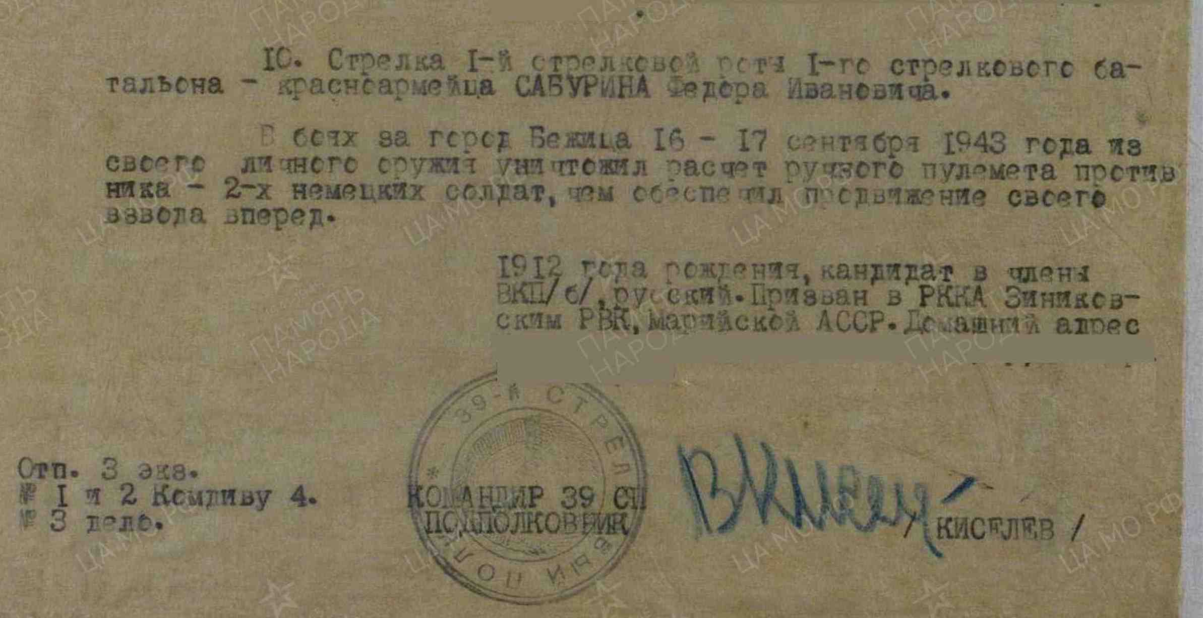 САБУРИН Фёдор Иванович, 1912, с. Алексеевское. Мобилизован Звениговским РВК МарССР 1 января 1942г. Ефрейтор, стрелок 39 СП и 41 отдельной разведроты 4 СД. Воевал на Брянском, Центральном и 1 Белорусском фронтах. Легко ранен 21 фев. 1943г. Награждён медалью "За боевые заслуги", орденом Красной Звезды.