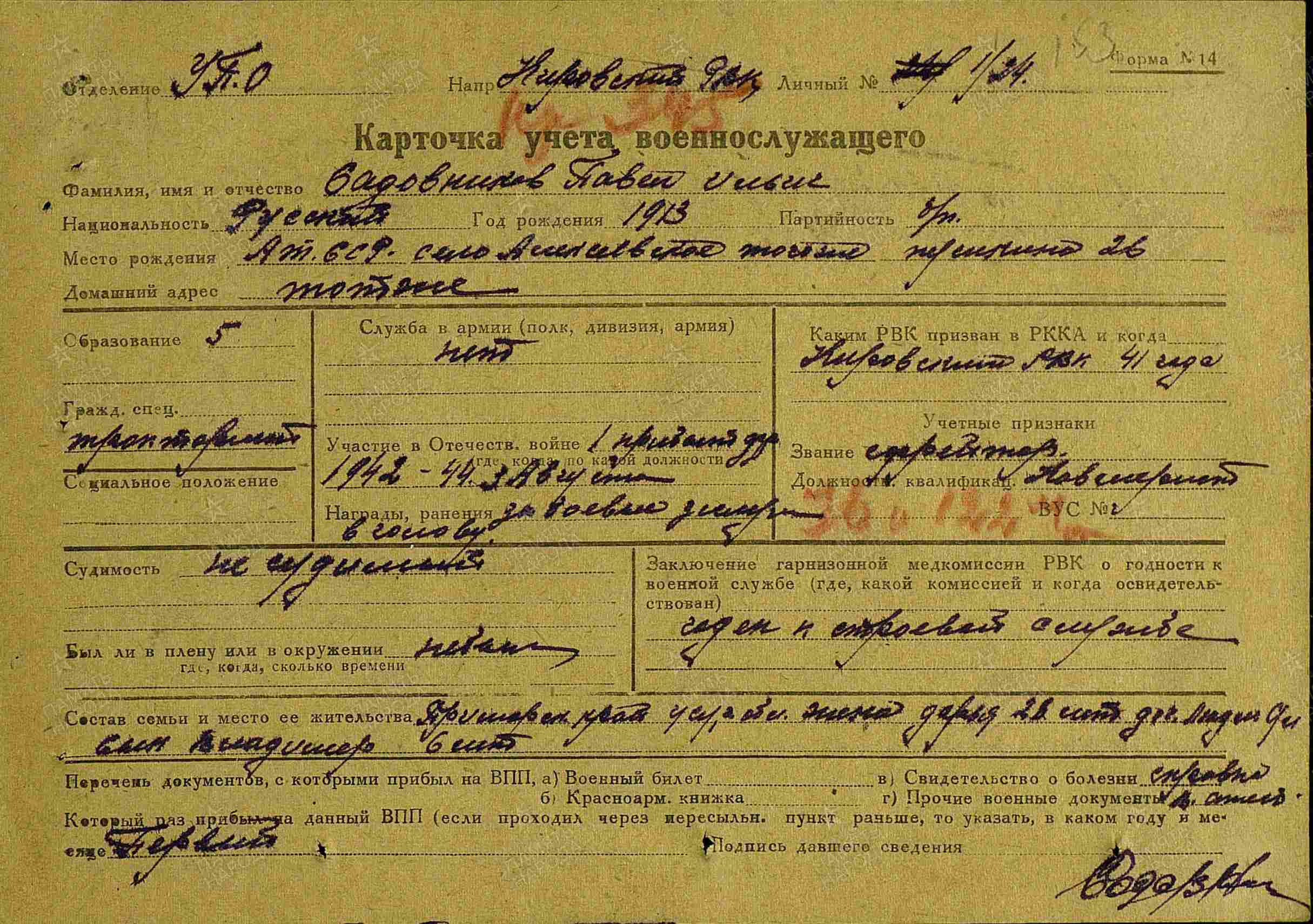 САДОВНИКОВ Павел Ильич, 1913, с. Алексеевское. В 1935-1937 проходил срочную службу в стрелковых частях РККА. Мобилизован в окт. 1941 Кировским РВК Уссурийской обл. Приморского края. Воевал на Закавказском, Северо-Кавказском, Южном, 4 Украинском, 1 Прибалтийском фронте в составе 9 А/ 44 А/ 28 А/ 51 А. Красноармеец/ ефрейтор, стрелок/ орудийный номер/ повозочный 907 АП 347 СД. Участник обороны Кавказа, освобождения Крыма, Прибалтики. За героизм при освобождении г. Севастополь награждён медалью "За боевые заслуги". Ранен в голову 3 авг. 1944. Проходил лечение в ЭГ 3845, Ивановская обл. После госпиталя, с янв. 1945 проходил службу в 228 отд. отряде разминирования на должности санинструктора. Демобилизован в нояб. 1945.