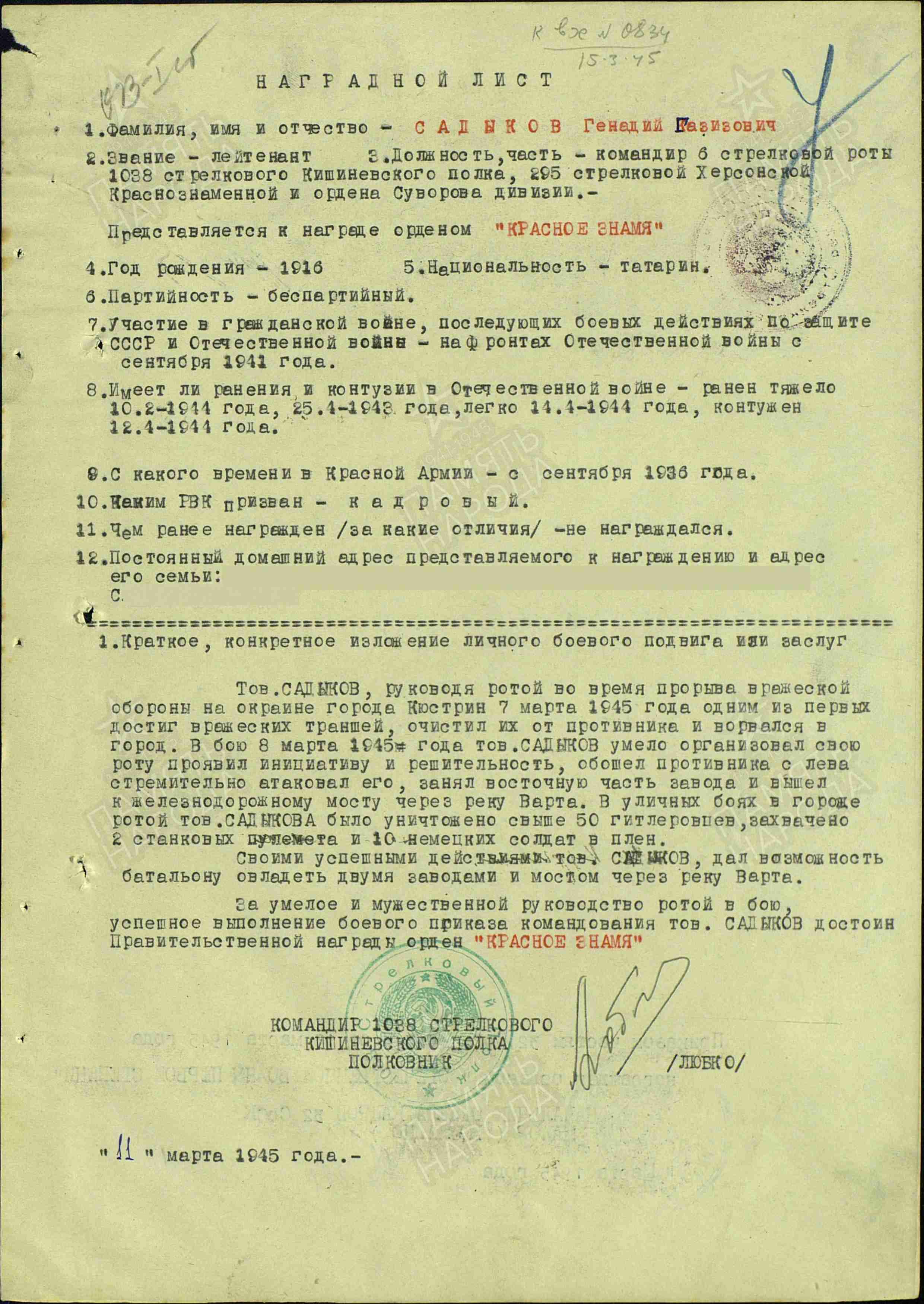САДЫКОВ Галим (Геннадий) Газизович, 1916, с. Мокрые Курнали. В РККА с 1936. Кадровый военный. В боях с сент. 1941. Перенёс два тяжёлых ранения (25 апр. 1943, 10 фев. 1944), лёгкое ранение 14 апр. 1944, контузию 12 апр. 1944. Проходил лечение в ЭГ 3635, г. Балашов. Мл. лейтенант, 631 СП 159 СД 5 А Западного фронта, в 1945 – лейтенант, ком. роты 1038 СП 295 СД 5 УдА 1 Белорусского фронта. Награждён орденом Отечественной войны 1 ст. Умер от ран 15 марта 1945, с. Штольберг, Бранденбург, Германия.