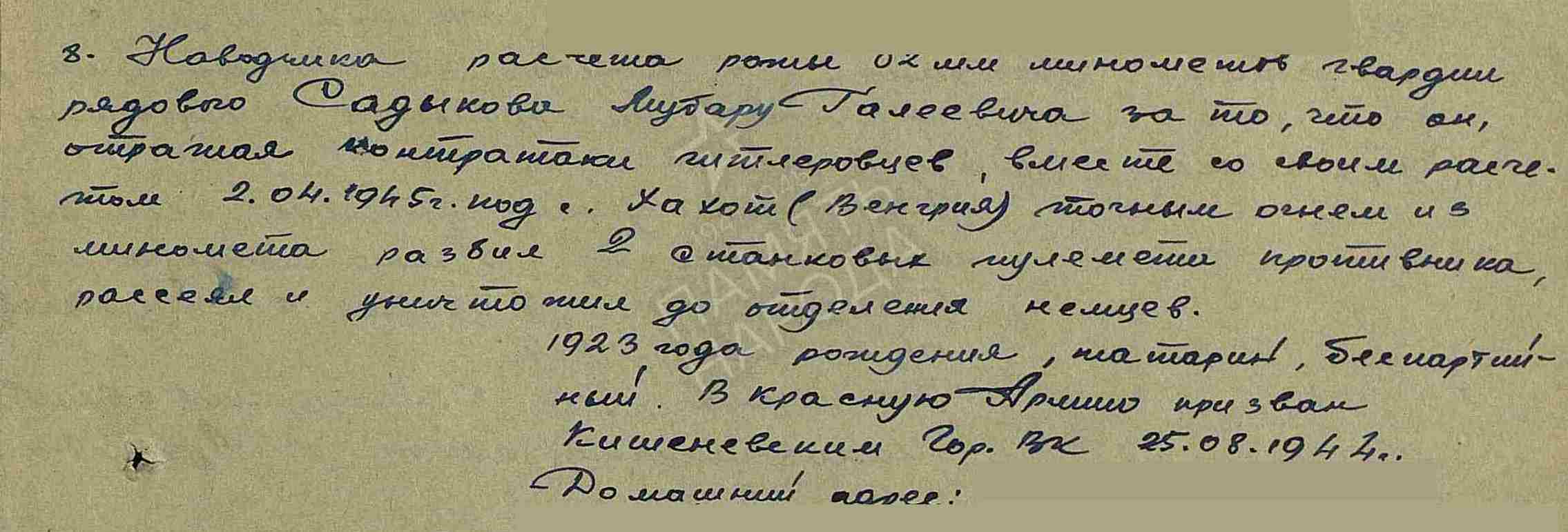 САДЫКОВ Мубарак Галеевич, 1923, с. Средние Тиганы/ п. Кызыл Октябрь. До 1944 биография не установлена. Мобилизован 25 авг. 1944 Кишенёвским ГВК Молдавской ССР. Воевал на 3 Украинском фронте в составе 5 УдА/ 37 А/ 57 А. Ошибочно учтён погибшим 17 сент. 1944. Гв. красноармеец, наводчик роты 82 мм миномётов 189 гв. СП 61 гв. СД. Участник освобождения Болгарии, Югославии, боёв в Венгрии. Награждён медалью «За отвагу».