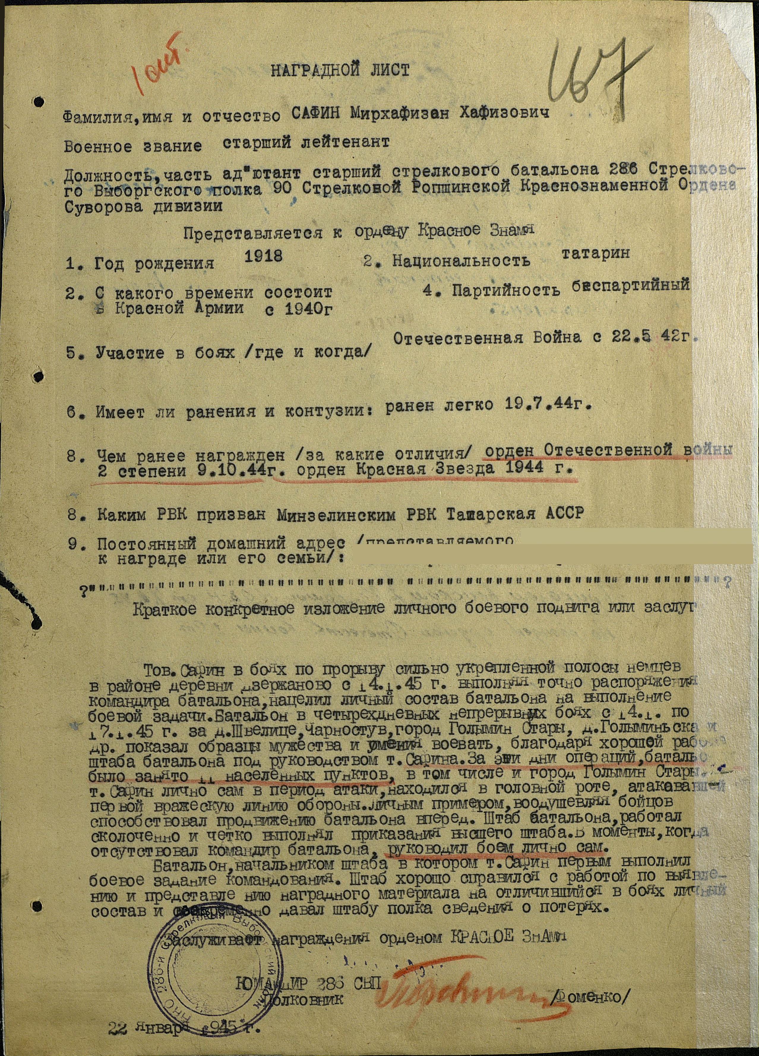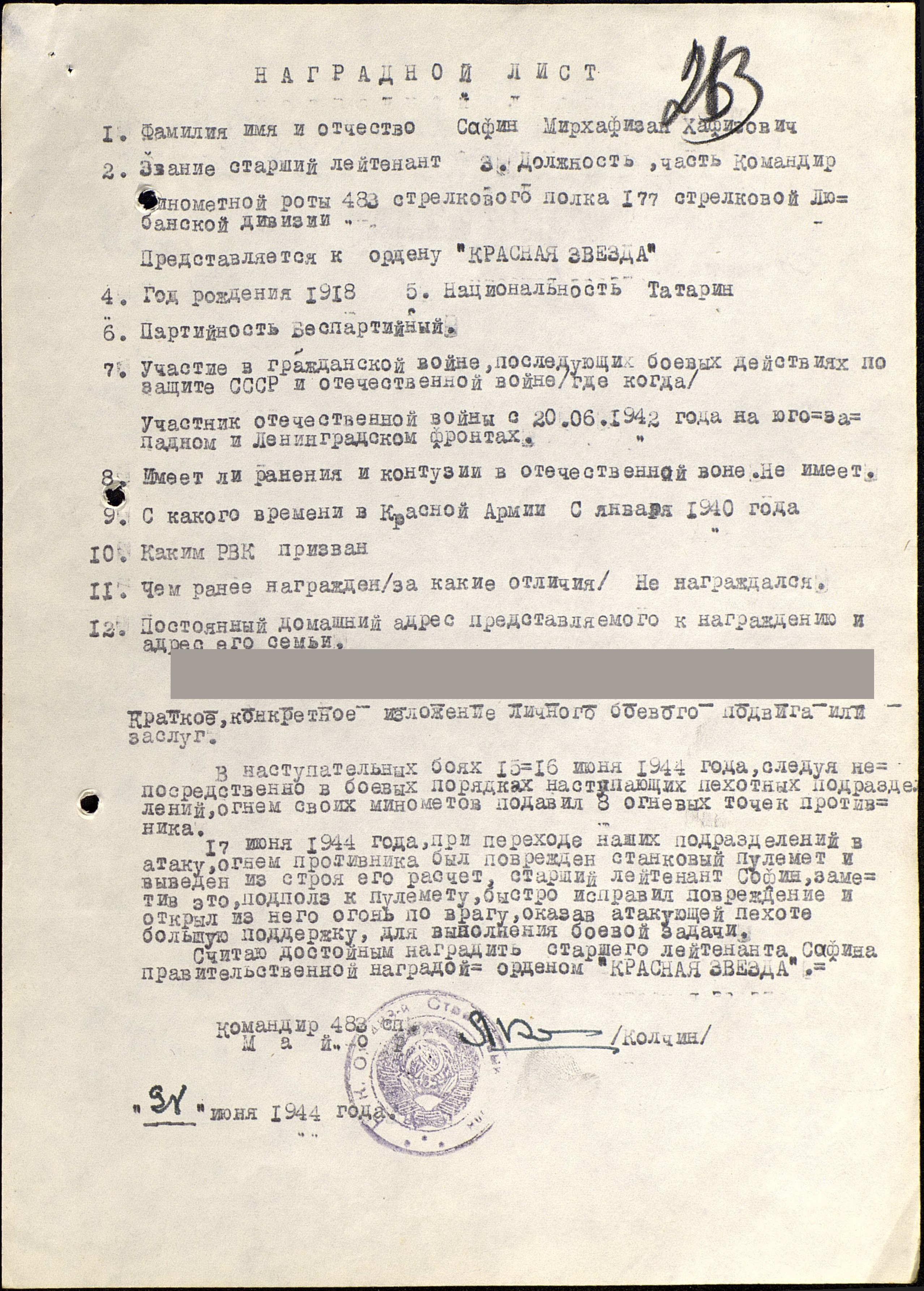 С 1944 года Сафин командир минометной роты 483 стрелковогом полка 177 стрелковой Любанской дивизии.
