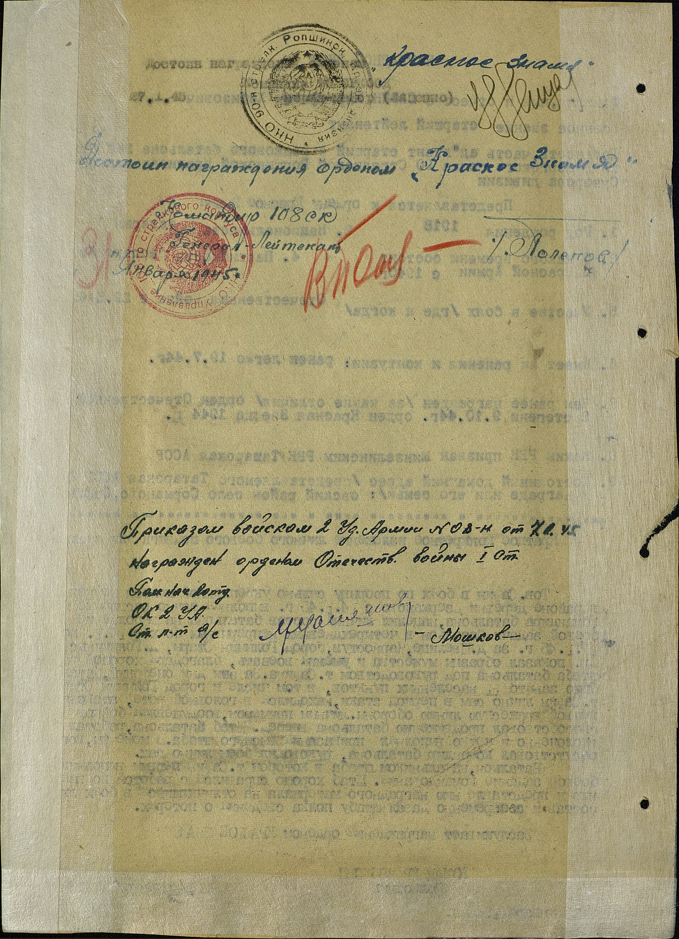 После ранения с января 1945 года в звании старшего лейтенанта служил старшим адъютантом 286 стрелкового Выборгского полка 90 стрелковой Ропшинского Краснознаменного ордена Суворова дивизии.