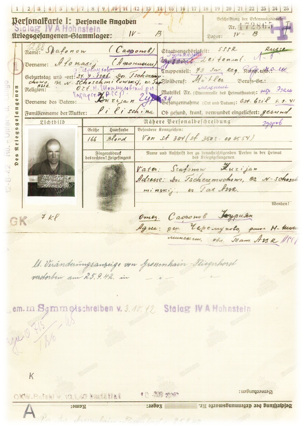 Сафонов Афанасий Гурьевич родился 24.09.1906 в с. Сл. Черемуховая Чистопольского уезда Казанской губернии Новошешминской волости. Был призван в РККА в 1938 году. Участник Великой Отечественной войны 1941-1945 годов. Служил в лейтенантом в воинской должности командир роты в 3-й отдельной стрелковой бригаде 8 армии Северо-Западного фронта. Пленен 09.09.1941г. на о.Сааремаа (Эзель); умер 25.09.1942 году в плену: г. Мюхльберг на Эльбе, Саксония, Германия [шталаг IV B].