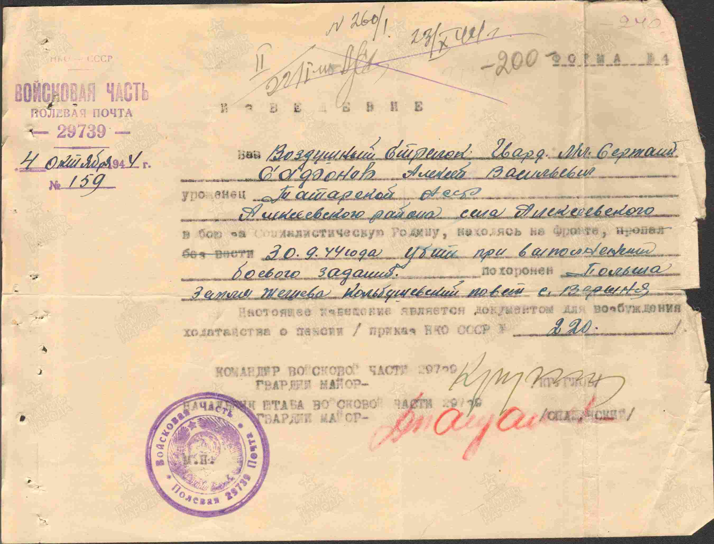 САФОНОВ Алексей Васильевич, 1925, с. Алексеевское. Мобилизован 11 янв. 1943 Алексеевским РВК. Окончил 67 авиационную школу воздушных стрелков-радистов. С 18 авг. 1944 воевал на 1 Украинском фронте в составе 2 ВА. Гв. мл. сержант, воздушный стрелок 140 гв. ШАП 8 гв. ШАД. Погиб 30 сент. 1944 при авиакатастрофе в ходе выполнения боевого задания, с. Верыня, Кольбушовский повят, Подкарпатское воеводство, Польша.
