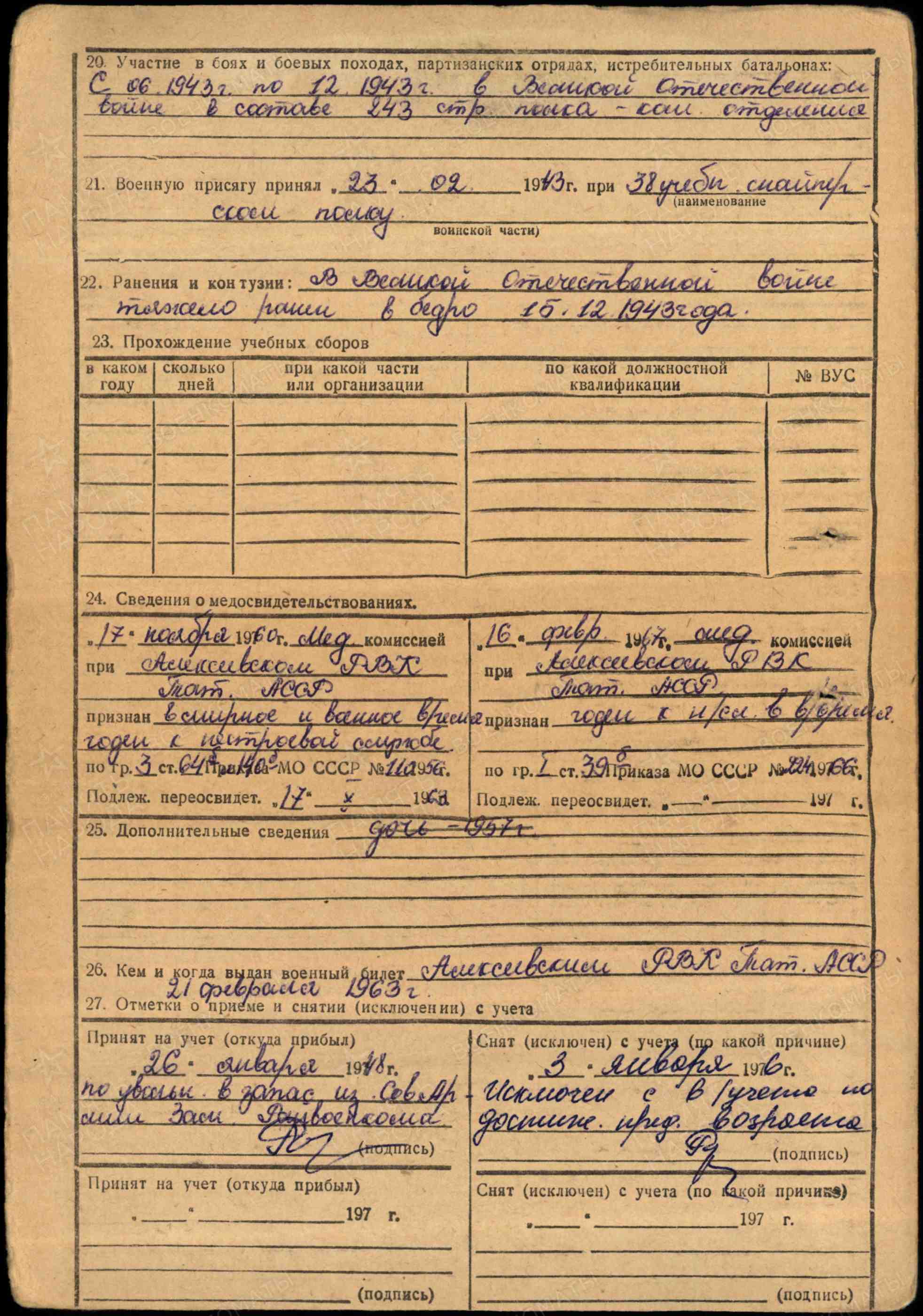 САФОНОВ Константин Осипович, 1925, д. Зотеевка. Член ВЛКСМ. До призыва в армию работал в к-зе Им. Максима Горького. Мобилизован 15 янв. 1943 Алексеевским РВК. В боях с авг. 1943. Мл. сержант, ком. отделения 243 СП 181 СД 65 А/ 13 А Центрального/ 1 Украинского фронта. Тяжело ранен в бедро в дек. 1943. До июля 1944 находился на излечении в госпитале. Направлен в 86 отд. строительный батальон, Забайкальский фронт. Демобилизован 28 нояб. 1946 по болезни. Работал зав. складом с-за «Красный Восток», п. Алексеевское. Награждён орденом Отечественной войны 2 ст. (1985).
