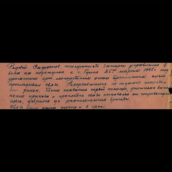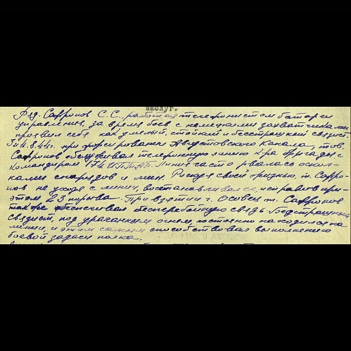 Рядовой Сафронов С.С. был телефонистом батареи управления. За время боев c немецкими захватчиками проявил себя как умелый, стойкий и бесстрашный связист.