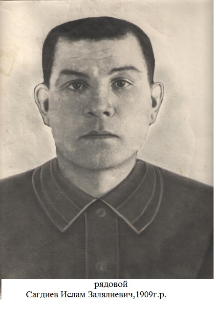 Сагдиев Ислам Залялиевич родился в 1909 году в с.Каргополь Алькеевского района ТАССР. Фронтовик. Участник Великой Отечественной войны 1941-1945гг. Призван Алькеевским РВК ТатАССР . Погиб в 1942 году. (Фотография и материалы предоставлены Каргопольским сельским поселением)