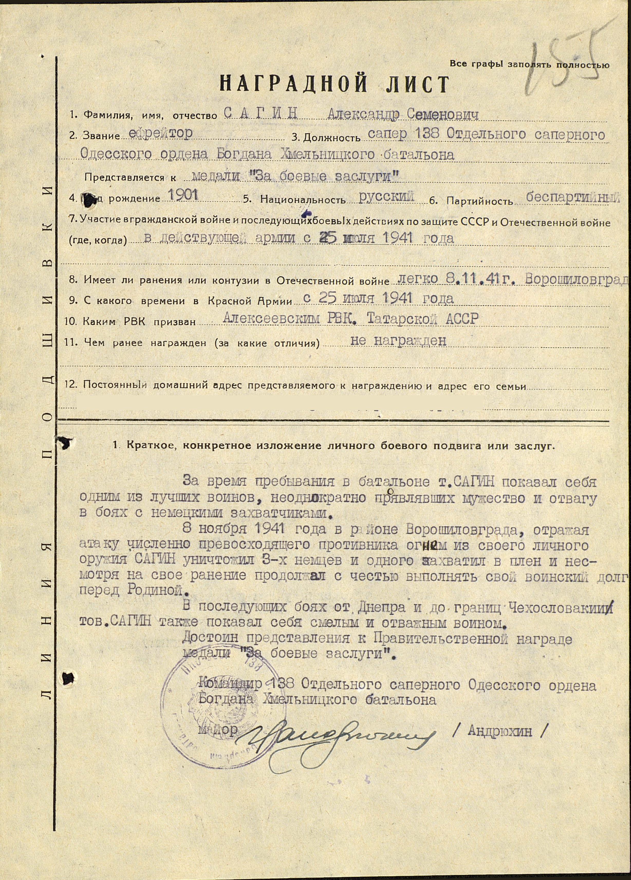 САГИН Александр Семёнович, 1901, с. Новоспасск. Мобилизован Алексеевским РВК 1 сент. 1941, по другим данным 25 июля 1941. Воевал на Северо-Кавказском, Южном, 4, 3 и 2 Украинском фронте в составе 51 А/ 2 гв. А/ 3 гв. А/ 6 гв. ТА/ конно-механизированной группы. Легко ранен 8 нояб. 1941 под г. Ворошиловград (Луганск). Ефрейтор, сапёр и повозочный хоз. взвода 138 отд. СапБ 4 гв. МехК. Участник обороны Кавказа, форсирования Днепра, освобождения Украины, Молдавии и Чехословакии, боёв в Румынии и Венгрии. Награждён медалями "За оборону Кавказа", "За боевые заслуги", орденом Отечественной войны 2 ст. (1985).