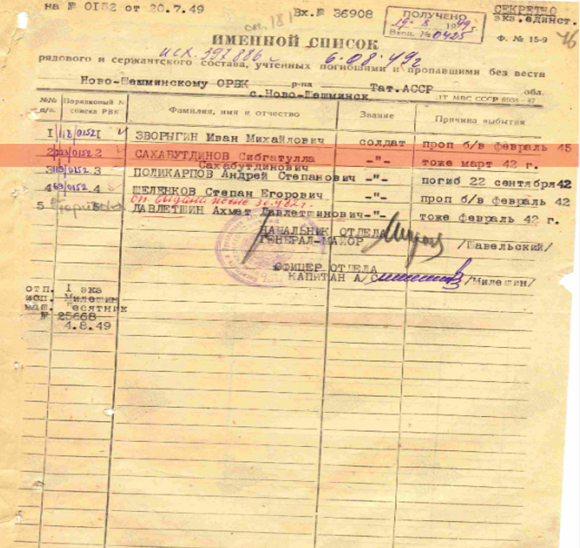 Сахабутдинов Сибгатулла Сахабутдинович родтлся в 1901 году в д.Татарское Волчье Новошешминский р-н. Призван Новошешминским РВК, кр-ц, 1201 сп,354 сд, Причина выбытия пропал без вести. Дата выбытия: __.03.1942 г., Московская обл. Солнечногорский р-н.
