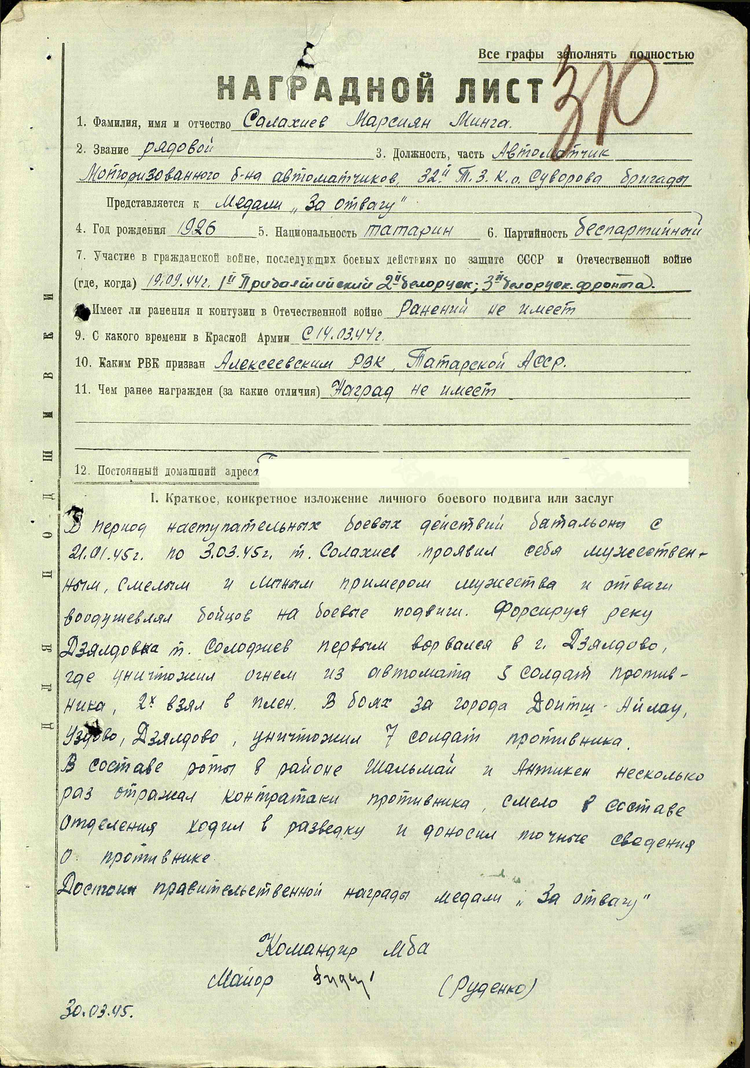 САЛАХИЕВ (САЛАХЕЕВ) Марсият Мингадеевич, 1926, с. Степная Шентала. До призыва в армию работал в к-зе Им. Вахитова. Мобилизован 5 нояб. 1943 Алексеевским РВК, повторно – 14 марта 1944. Воева с 19 сент. 1944 на 1 Прибалтийском и 2 Белорусском фронте с составе 5 гв. ТА. Участник освобождения Прибалтики и Польши. Красноармеец, стрелок мотобатальона автоматчиков 32 ТБр 29 ТК. Награждён медалью «За отвагу», "За доблестный труд в Великой Отечественной войне 1941-1945 гг".