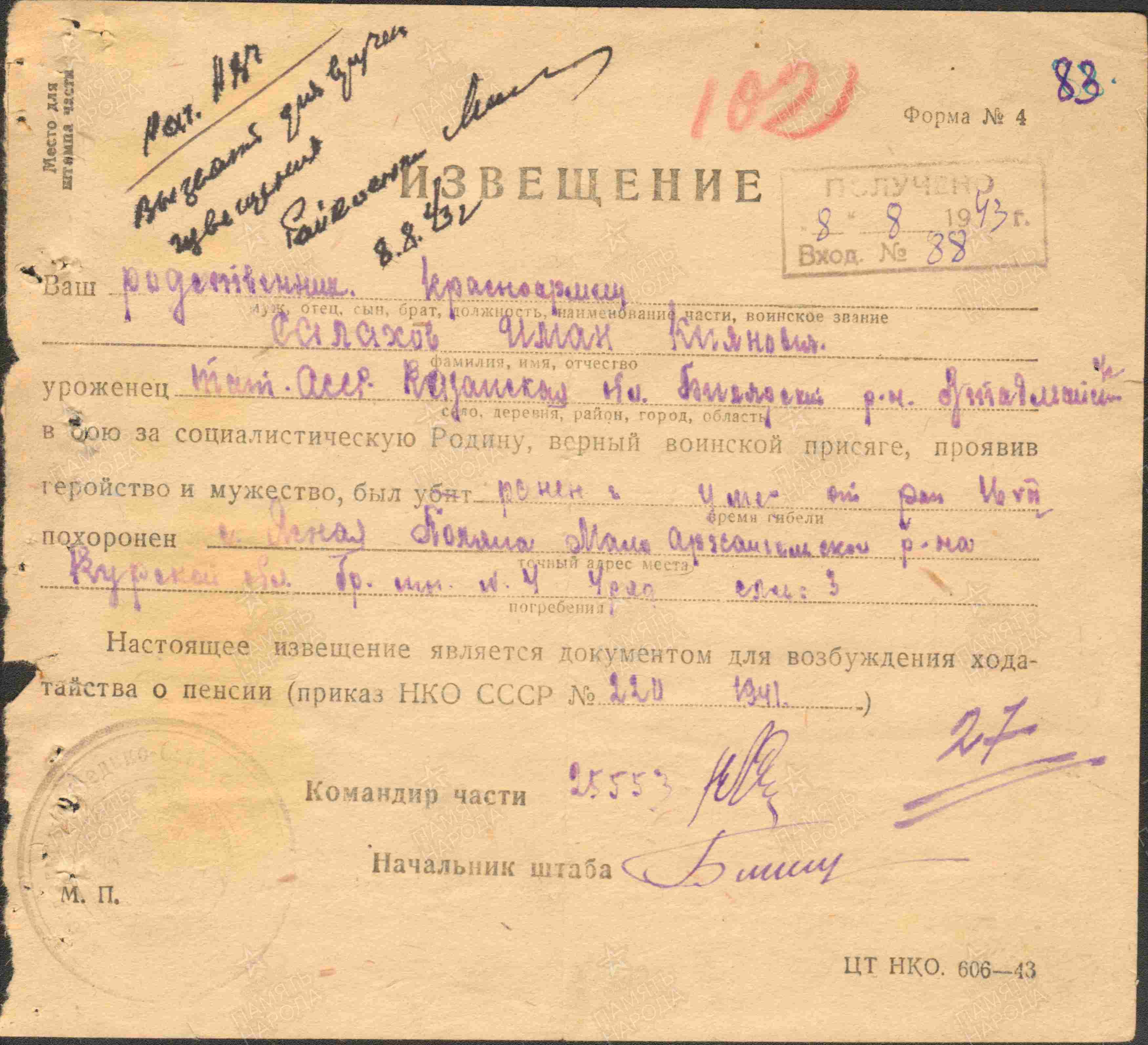 САЛАХОВ Имам Киямович, 1923, с. Верхняя Татарская Майна. До призыва в армию работал в к-зе «Кызыл Октябрь». Мобилизован Билярским РВК 1 апр. 1942. Красноармеец, 109 СП 74 СД 13 А Брянского/ Центрального фронта. Участник битвы на Курской дуге. Умер 16 июля 1943 от тяжёлых осколочных ранений конечностей в 19 отд. МСБ, д. Ясная Поляна, Малоархангельский р-н, Курская (Орловская) обл.