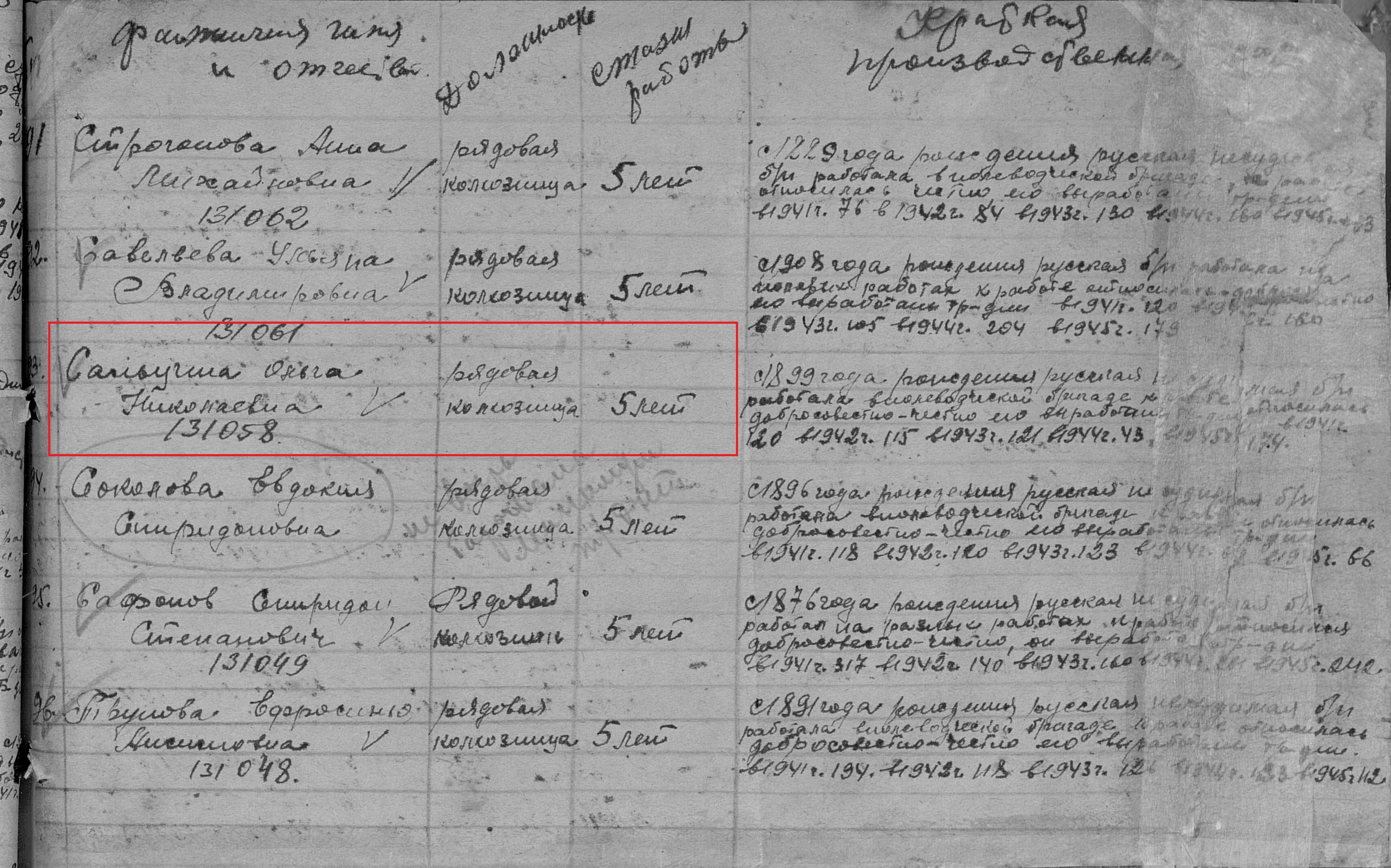 Сальцина Ольга Николаевна родилась в 1899 году в с.Сл.Черемуховая Казанской губернии Чистопольского уезда Новошешминской волости. В годы Великой Отечественной войны работала в колхозе "8-е Марта" колхозницей. Награждена медалью "За доблестный труд в Великой Отечественной войне 1941–1945 гг." (Акт от 28 апреля 1947г., фонд 3610, опись 2, дело 325, лист 89, АК № 131058). Умерла в 1970 году, похоронена на сельском кладбище с.Сл. Черемуховая.