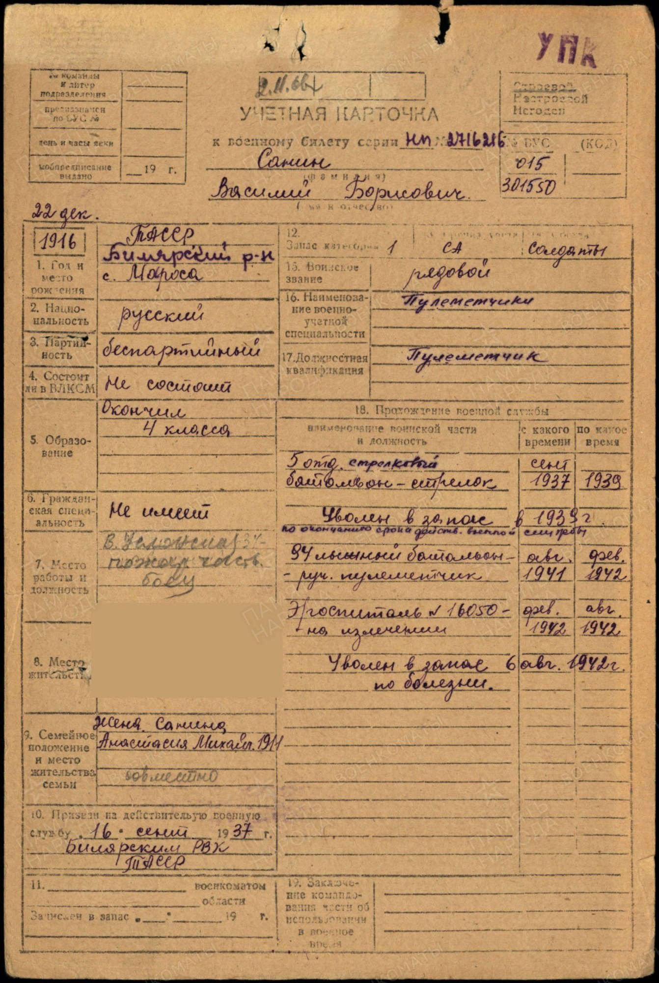 САНИН Василий Борисович, 1916, с. Русская Мараса. Мобилизован Билярским РВК в 1937 на срочную службу. В 1939 зачислен в запас. Призван в авг. 1941 Верхнеуслонским РВК. Красноармеец, пулемётчик 94 отд. лыжного батальона 2 УдА Волховского фронта. Тяжело ранен в левую ногу 23 фев. 1942. Находился на излечении в ЭГ 1650, г. Пенза. Работал бойцом Верхнеуслонской части пожарной охраны. Награждён орденом Славы 3 ст. указом Президиума ВС СССР от 24 сент. 1966.