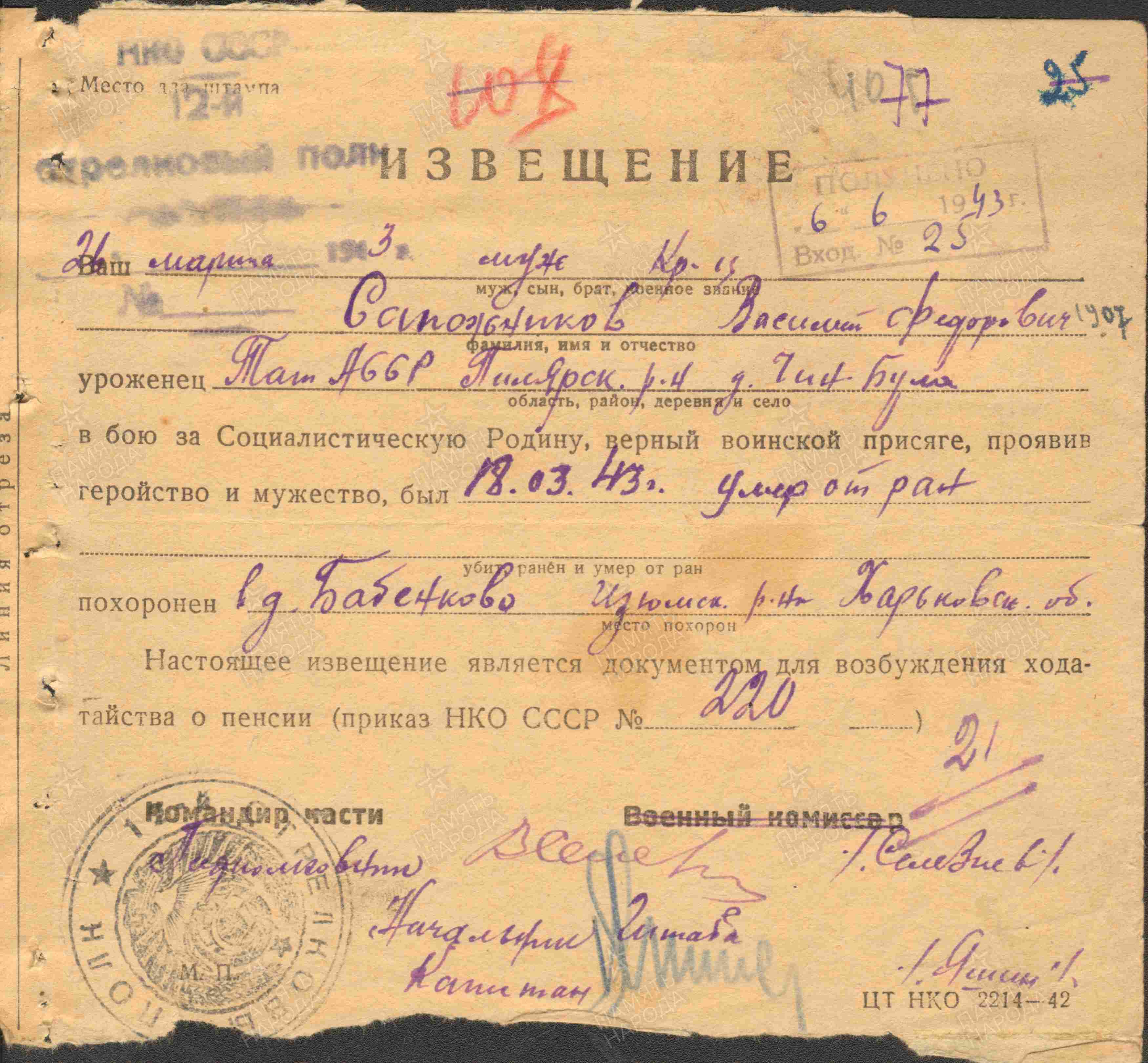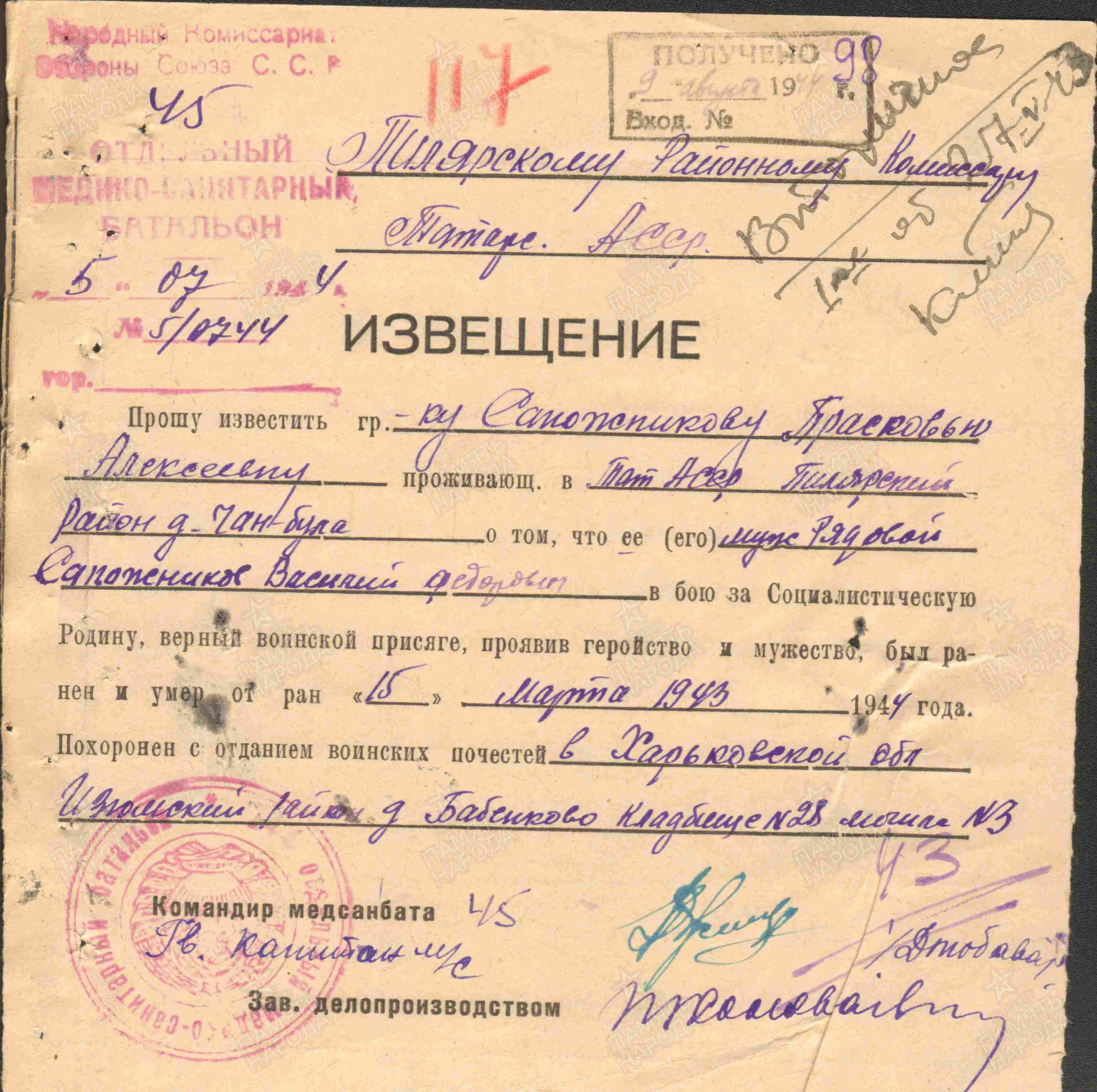 САПОЖНИКОВ Василий Фёдорович, 1907, д. Тиган Булак. Мобилизован Билярским РВК 27 авг. 1941. В 1943 – красноармеец, 12 СП 53 СД 43 А/ 33 А Западного фронта. 1 гв. А Юго-Западного фронта. Умер от ран в 45 отд. медсанбате дивизии 18 марта 1943, д. Бабенково, Изюмский р-н, Харьковская обл., УССР.