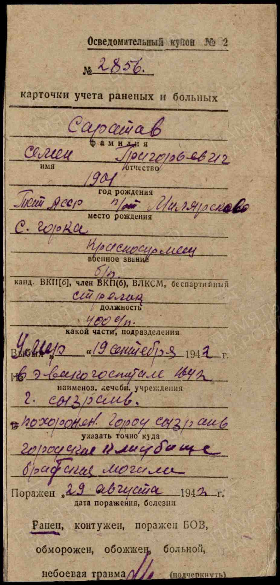 САРАТОВ Семён Григорьевич, 1901(2), с. Богоявленская Горка. Мобилизован 12 нояб. 1941 Билярским РВК. Красноармеец, стрелок 400 СП 89 СД Северной группы войск Закавказского фронта. В боях получил сквозное осколочное ранение правого коленного сустава с переломом эпифиза бедра. Находился на лечении в ЭГ 1642, г. Сызрань, где проведена ампутация. Умер от сепсиса 19 сент. 1942. Похоронен в братской могиле на городском кл-ще. Увековечен на мемориальном комплексе по ул. Советская, 2.