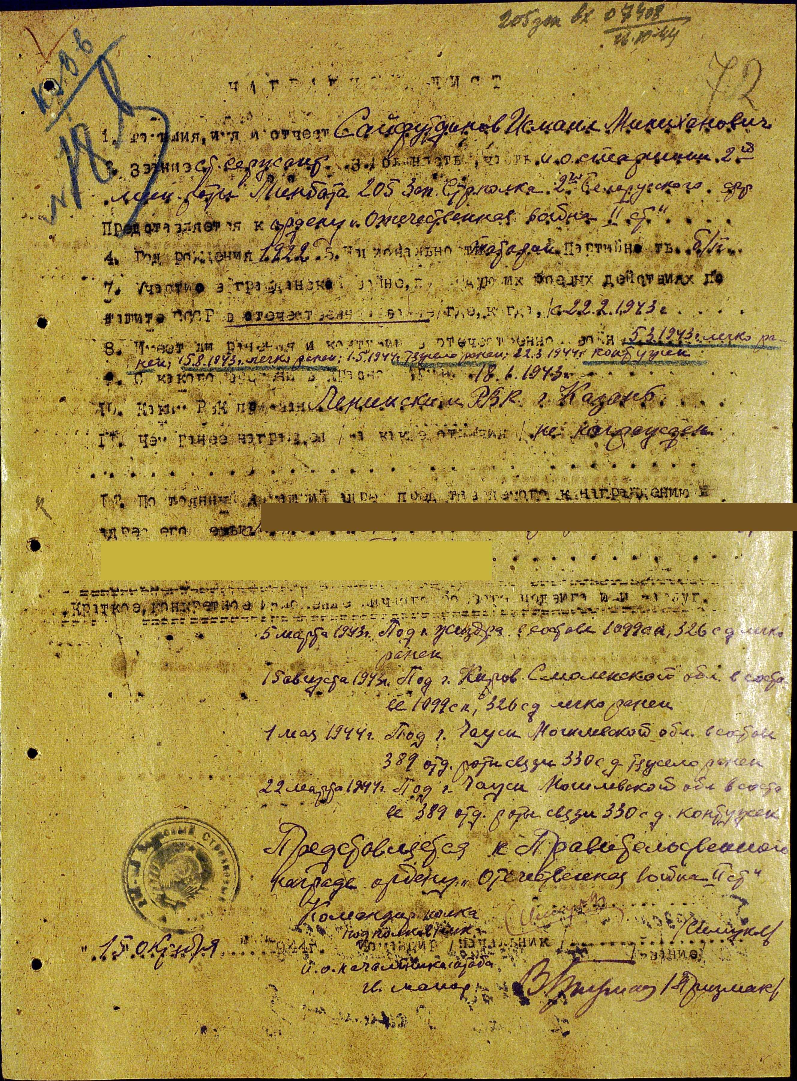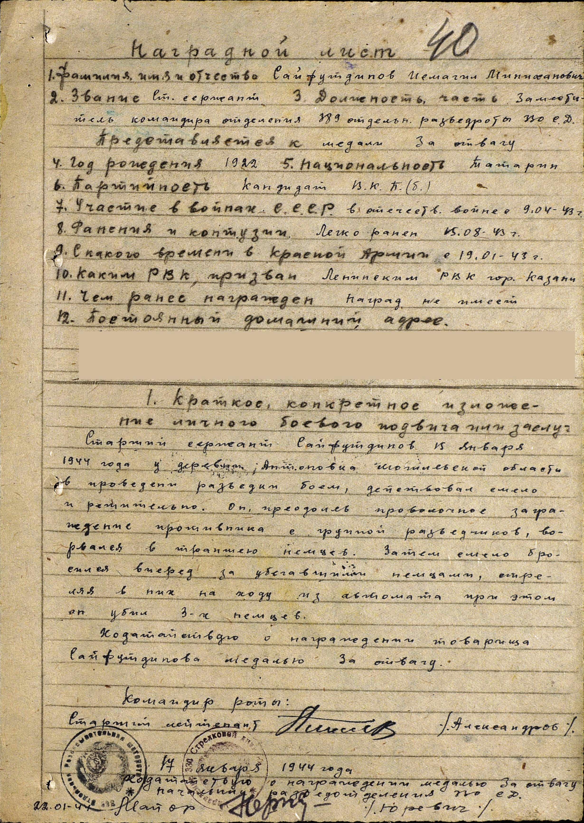 САЙФУТДИНОВ Исмагил Минниханович, 1922, с. Степная Шентала. Мобилизован в январе 1943 г. Ленинским РВК г. Казани. На фронте с февраля 1943 г. в составе 1099 стр. полка 326 стр. дивизии. Под г. Жиздра 5 марта 1943 г. был ранен легко. 15 августа 1943 г. в составе того же полка при освобождении г. Киров Смоленской обл. был ранен легко вторично. После излечения направлен в 389 отдельную развед. роту 330 стр. дивизии, ст. сержант, командир отделения. В январе 1944 г. во время разведки боем проявил себя героически и был награждён медалью "За отвагу". 22 марта 1944 г. при освобождении Могилёвской области Белоруссии был ранен тяжело. 1 мая 1944 г. в той же области был контужен. Как ограниченно годный к строевой службе в результате 3-х ранений и контузии был переведён в 205 запасной стрелковый полк 2 Белорус. фронта в качестве старшины 2 миномётной роты миномётного батальона данного полка. Награждён орденом Красной Звезды (представлялся к ордену Отечественной войны 2 ст.), медалью "За победу над Германией". Демобилизован в 1945 г. Скончался в 1953 г.