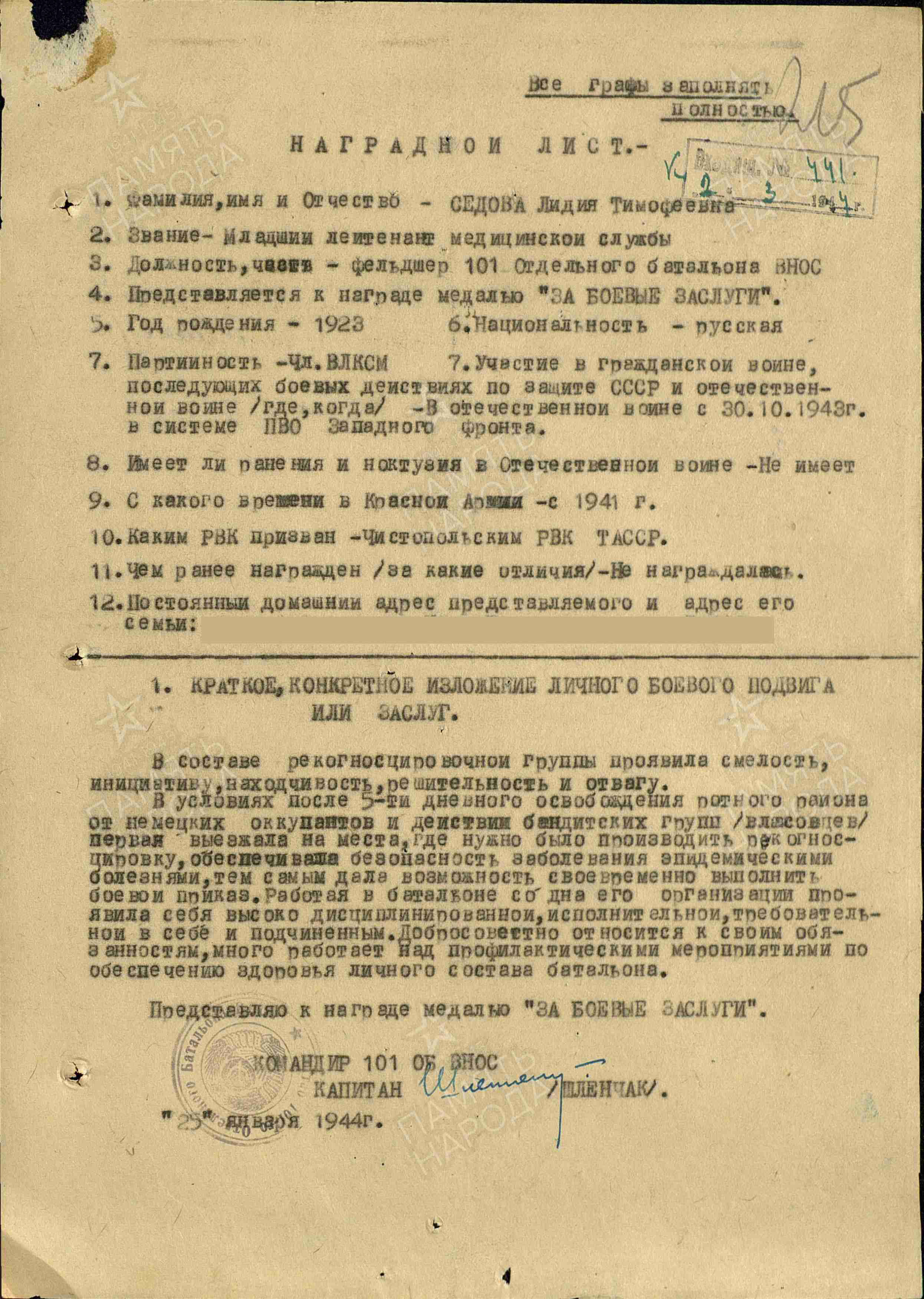 Лидия Тимофеевна Седова родилась в 1923 году в д.Аверьяновка Новошешминского района Татарской АССР. В 1941 году была призвана в ряды Красной Армии Чистопольским РВК, участница Отечественной войны с 30 апреля 1942 г. Служила в звании младший лейтенант медицинской службы в должности фельдшера 101 Отдельного батальона ВНС. Была награждена медалями «За боевые заслуги» (25.01.1944), «За победу над Германией в Великой Отечественной войне 1941-1945 гг.» (ноябрь 1941).