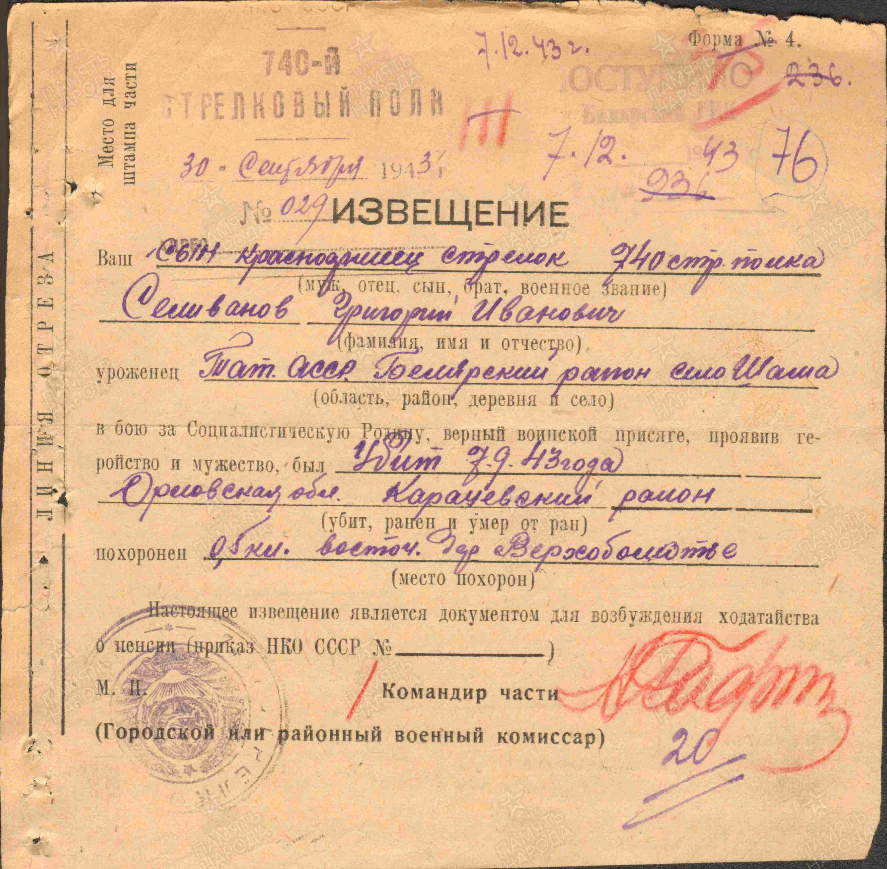 СЕЛИВАНОВ Григорий Иванович, 1923, с. Шама. До призыва в армию работал в к-зе «Трудовик». Член ВЛКСМ. Мобилизован Билярским РВК 15 дек. 1942. Красноармеец, 740 СП 217 СД 11 гв. А Западного/ Брянского фронта. Участник битвы на Курской дуге (северный фас, наступательный этап). Погиб 5 сент. 1943, с. Верхополье, Карачевский р-н, Орловская (Брянская) обл.