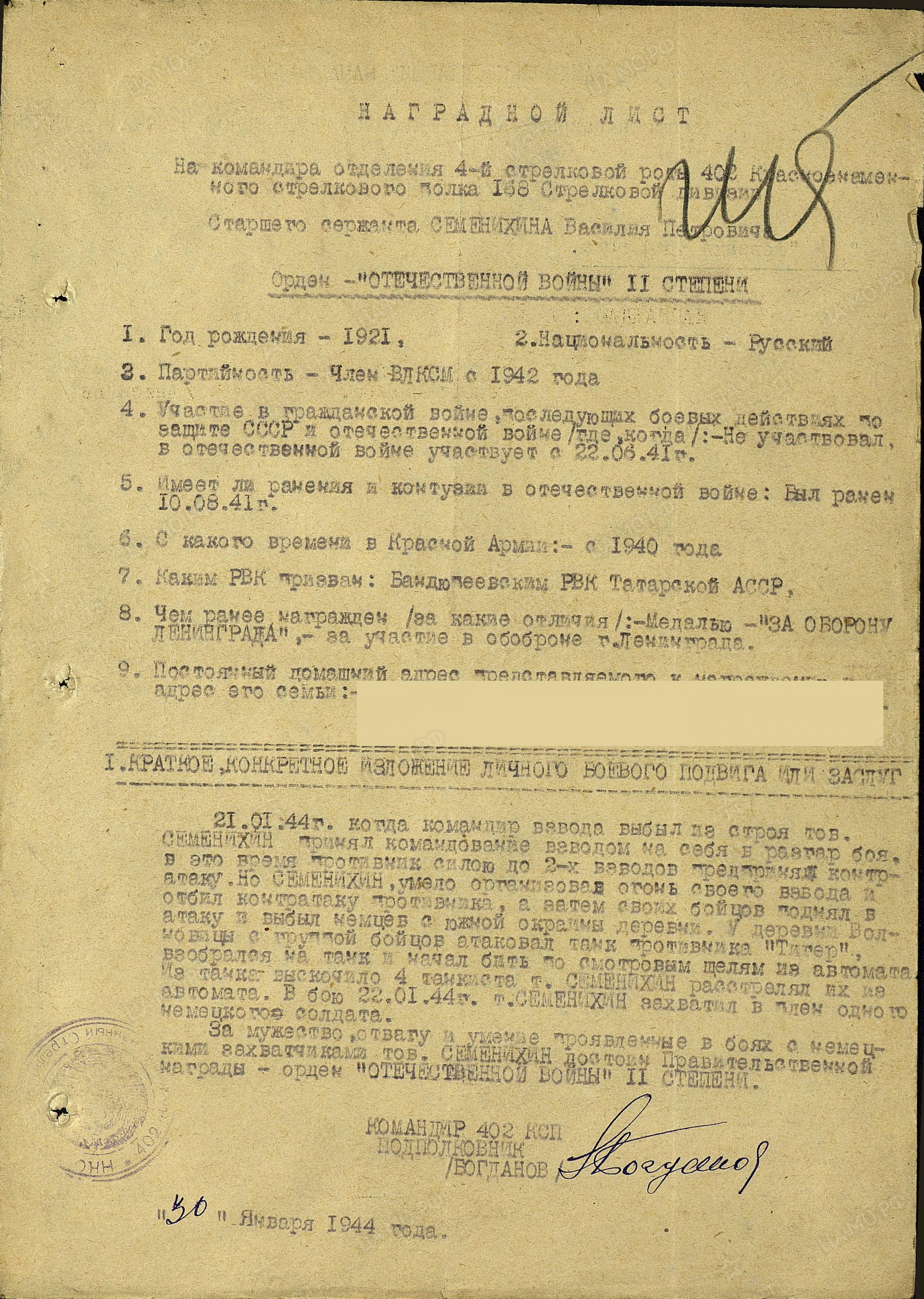 Из наградного листа: 21.01.1944 г., когда командир взвода выбыл из строя, тов. Семенихин принял командование взводом в самый разгар боя. В это время противник силою до двух взводов предпринял контратаку. Но Семенихин, умело организовав огонь своего взвода, отбил контратаку противника, затем своих бойцов поднял в атаку и выбил немцев с южной окраины деревни. В деревне Волковицы с группой бойцов атаковал танк противника «Тигр», взобрался на танк и начал бить по смотровым щелям из автомата. В бою 22.01.1944 г. т.Семенихин захватил в плен немецкого солдата».