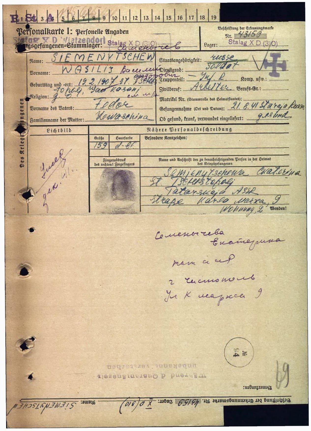 Родился 19 февраля 1907 г. в Чистополе. Пленен 21 августа 1941 г. под Старой Руссой. Содержался в шталаге X D (310). Лагерный номер 43159. Красноармеец Семенычев Василий Федорович погиб в плену в декабре 1941 г. Первичное место захоронения: Витцендорф (г. Запорожье).