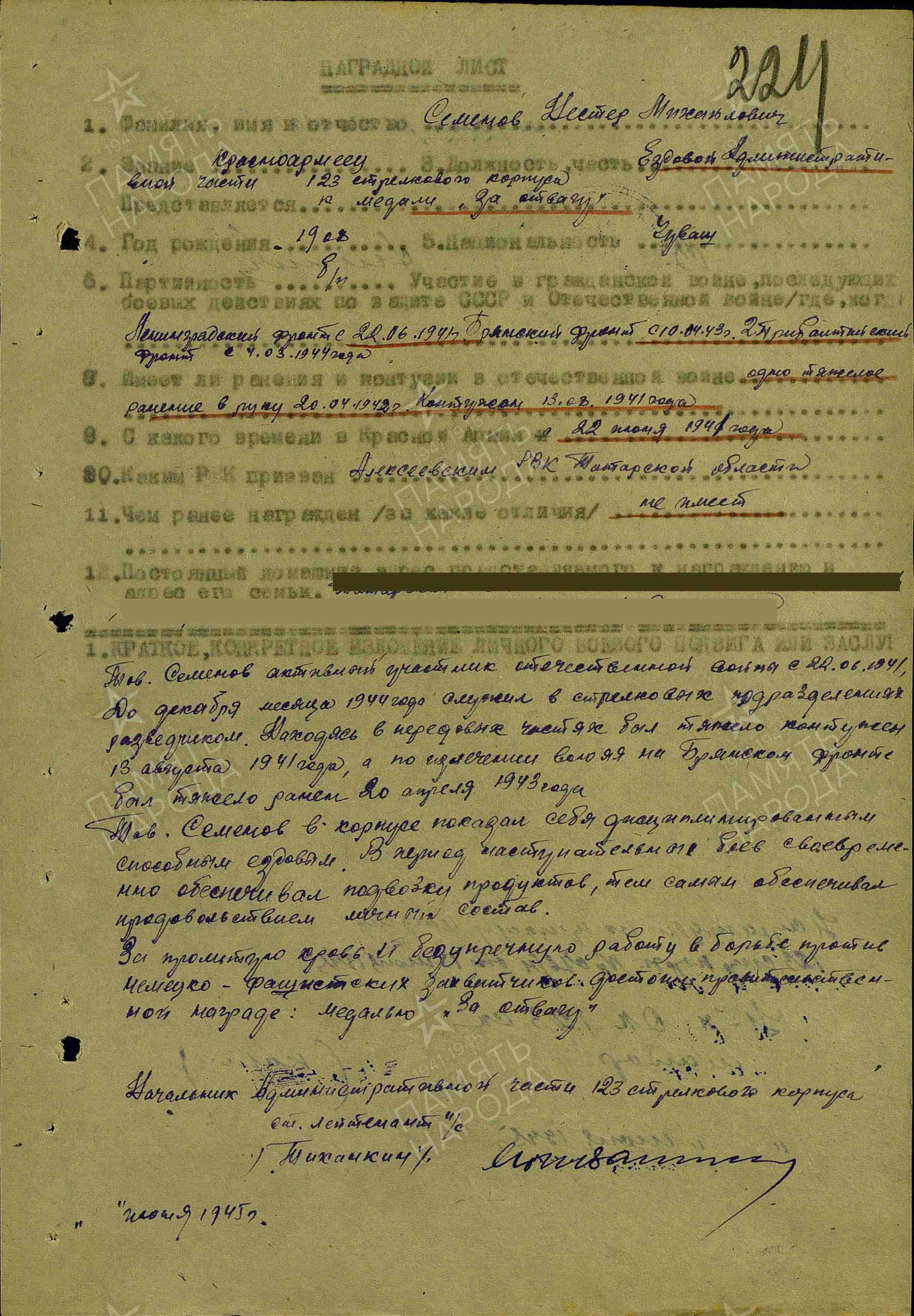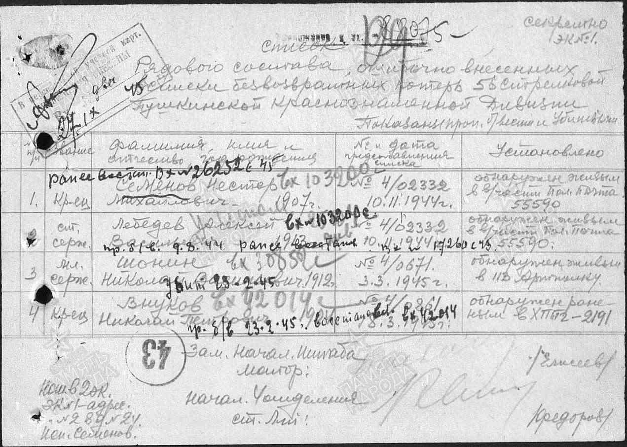 СЕМЁНОВ Нестор Михайлович, 1908(7), Чебоксарский уезд, Казанская губ. Жил в д. Солонцы. Мобилизован 13 июля 1941 Алексеевским РВК. Красноармеец, стрелок 1003 СП 279 СД 50 А Брянского фронта. Тяжело контужен 13 авг. 1941. Находился на лечении в ЭГ 2314, г. Москва, ЭГ 1673, г. Казань. В дальнейших боях перенёс тяжёлое ранене в руку. По излечении повторно мобилизован 19 июля 1943. Воевал в составе 184 СП 56 СД 67 А Ленинградского/ 1 УдА 3 Прибалтийского фронта. Ошибочно учтён пропавшим без вести 9 авг. 1944. В 1945 – ездовой административно-хозяйственной части Управления 123 СК 42 А 2 Прибалтийского/ 1 УдА Ленинградского фронта. Награждён медалью «За отвагу».