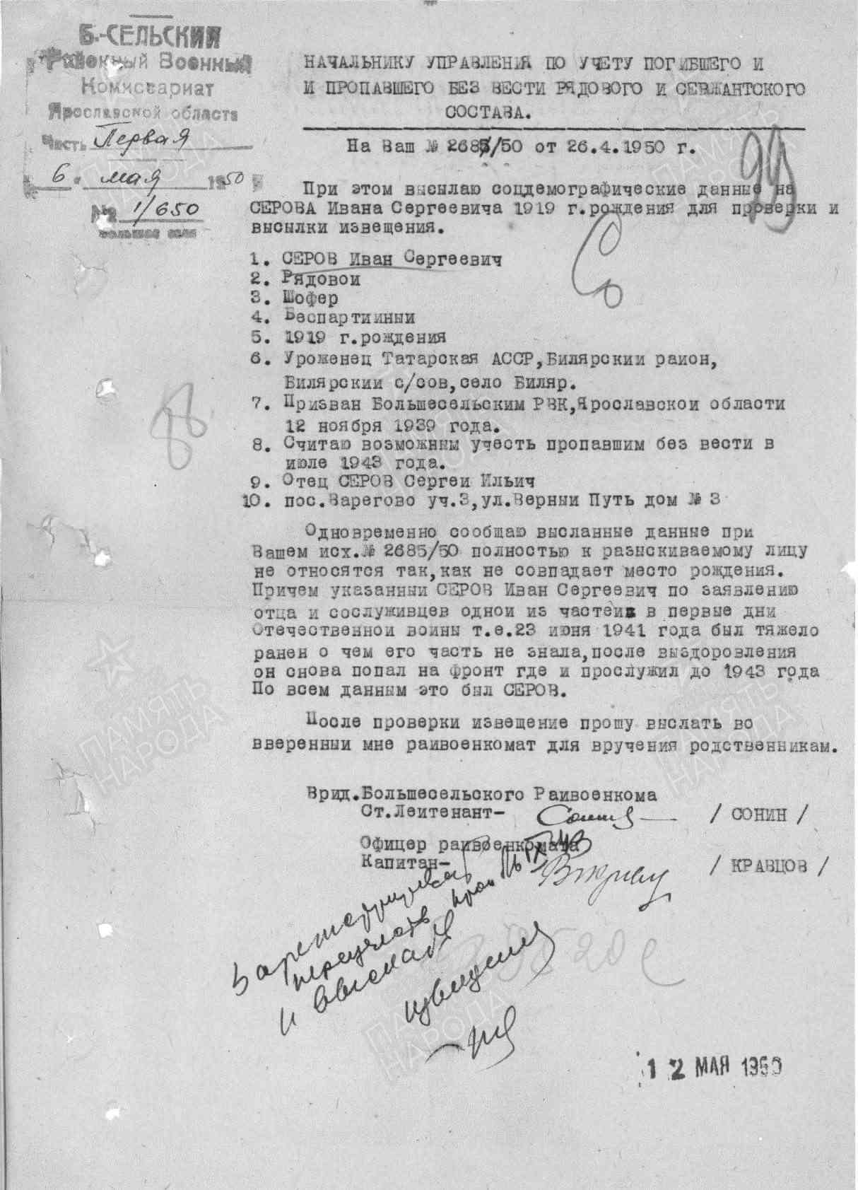 СЕРОВ Иван Сергеевич, 1919, с. Билярск. Мобилизован Большесельским РВК Ярославской обл. 12 нояб. 1939. Красноармеец, шофёр 12 АП 12 ТД 8 МехК 26 А Юго-Западного фронта. Пропал без вести 26 июня 1941 в р-не г. Броды, Львовская обл., УкрССР.