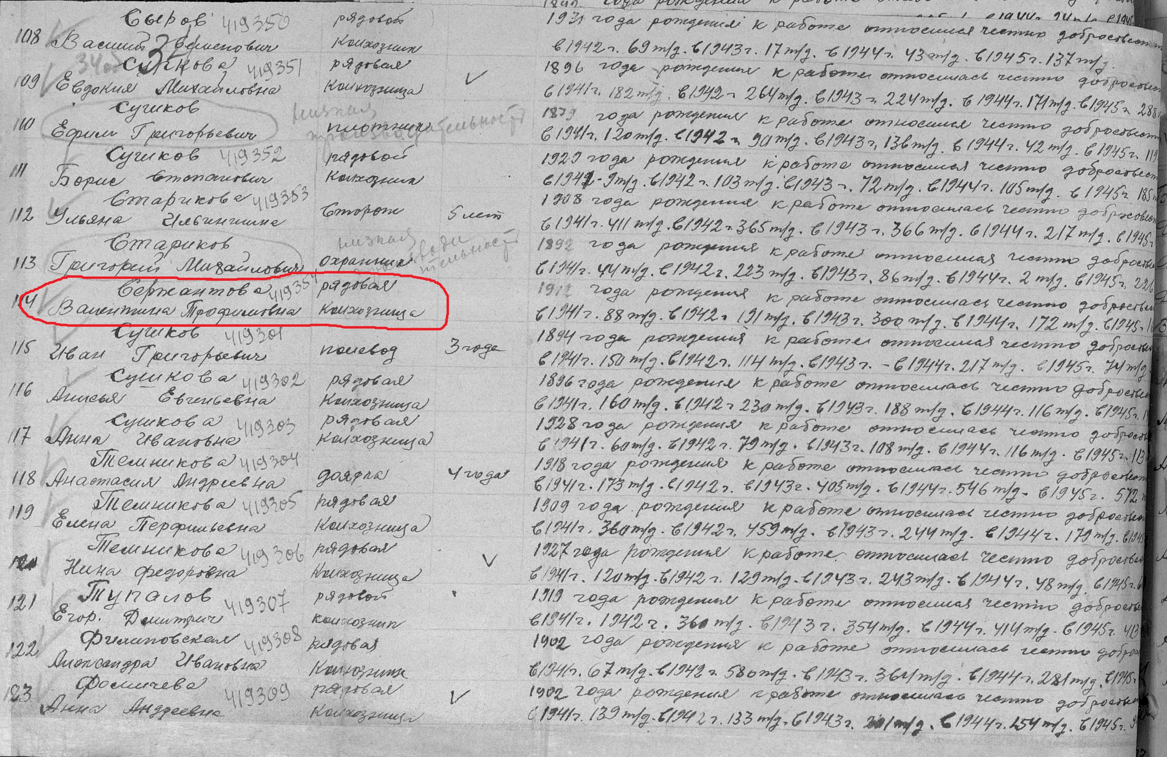 Сержантова Валентина Трофимовна родилась в 1912 году. Место жительства: с.Ново-Шешминск Ново-Шешминский район ТАССР. В годы Великой Отечественной войны работала в колхозе «Красный Октябрь» рядовой колхозницей. Награждена медалью "За доблестный труд в Великой Отечественной войне 1941–1945 гг." (Акт от 28 апреля 1947 г, фонд 3610, опись 2, дело № 325, лист 34, № 419354). .