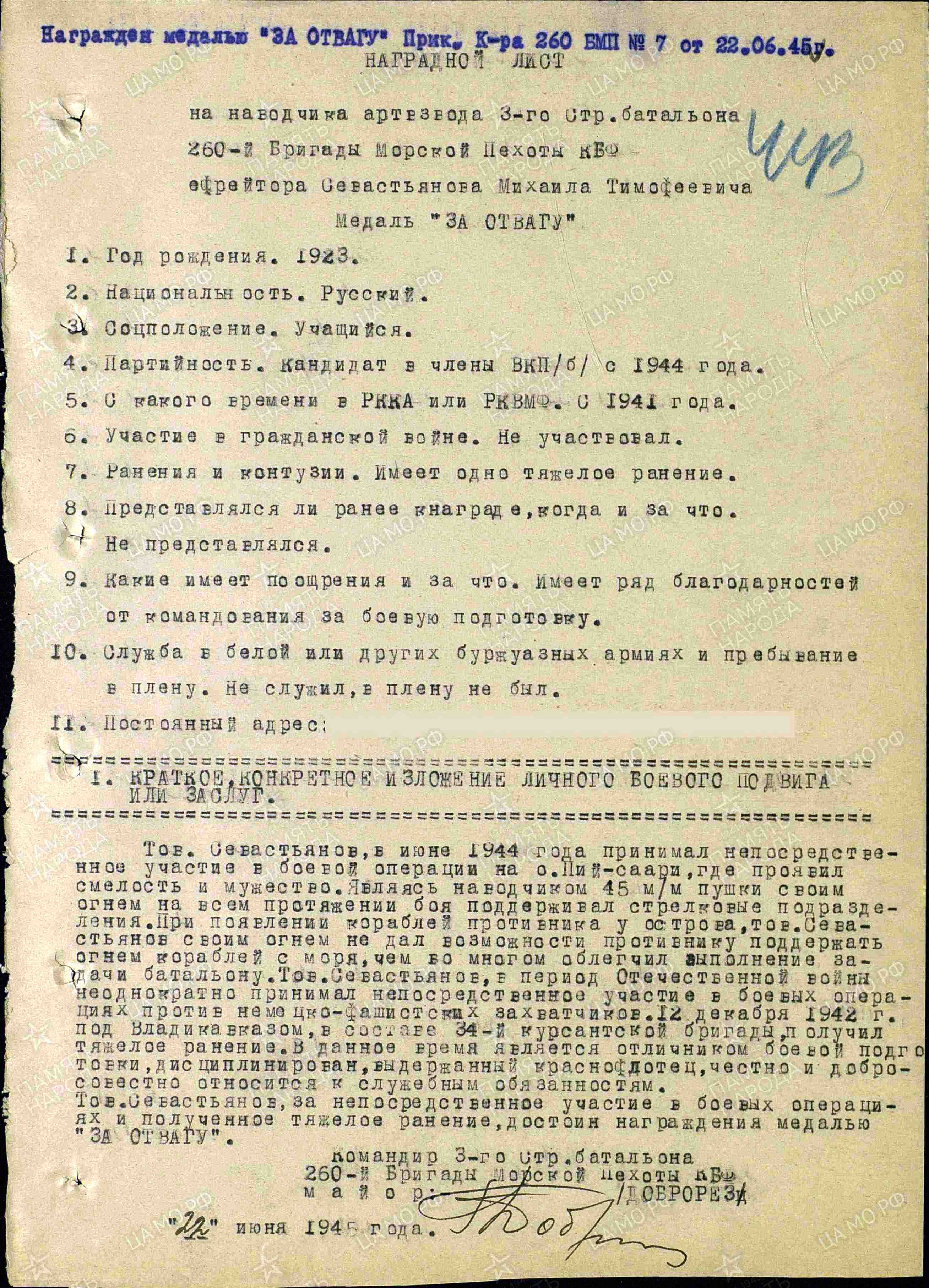 СЕВАСТЬЯНОВ Михаил Тимофеевич, 1923, с. Алексеевское. Член ВЛКСМ. Мобилизован из г. Баку в 1941. Зам. ком. отделения 34 отд. СБр 9 А Закавказского фронта. Тяжело ранен 8 нояб. 1942. Повторно мобилизован 20 сент. 1943 Алексеевским РВК. Направлен в Ярославский флотский экипаж, затем в состав 260 отд. бригады морской пехоты Краснозн. Балтийского флота. Ефрейтор, наводчик 45 мм пушки. Героически проявил себя в июне 1944 во время Бьёркской десантной операции на о. Пийсаари (Северный Берёзовый) архипелага Койвисто в Балтийском море. Демобилизован 26 марта 1947. Награждён медалью «За отвагу», орденом Отечественной войны 1 ст. (1985).
