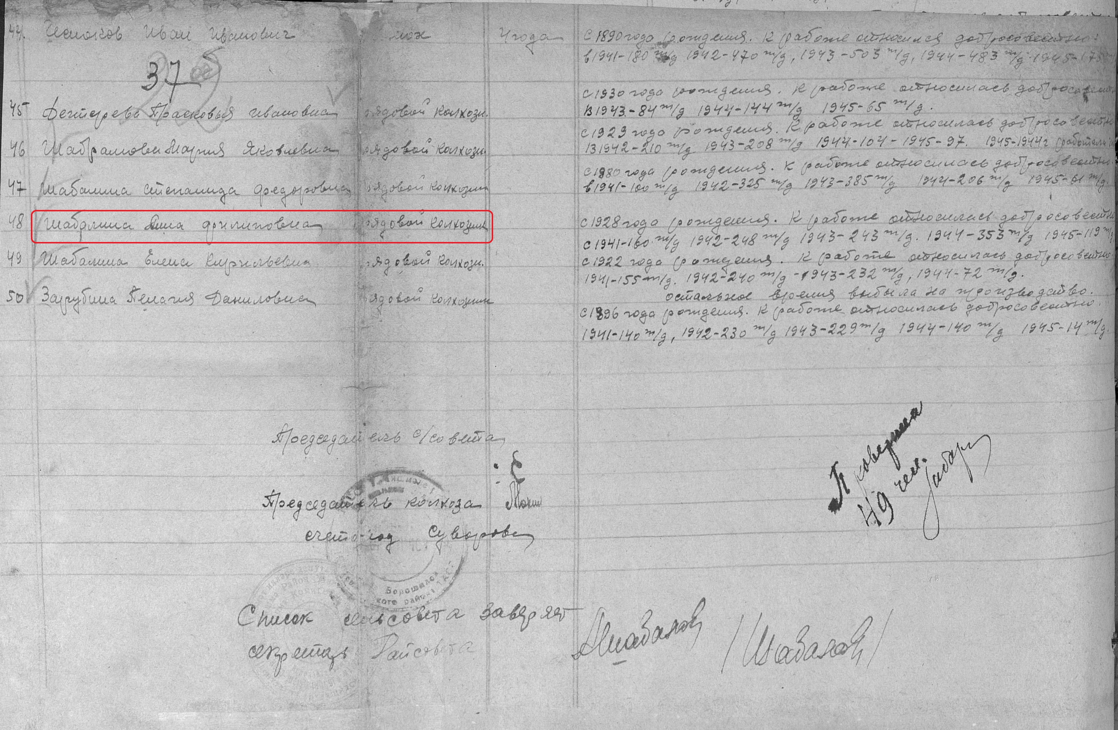 Шабалина Анна Филипповна родилась в 1928 году. Место жительства: п. Елховка Ново-Шешминский район ТАССР. В годы Великой Отечественной войны работала в колхозе им. Ворошилова рядовой колхозницей. Награждена медалью "За доблестный труд в Великой Отечественной войне 1941–1945 гг." (Акт от 28 апреля 1947 г, фонд 3610, опись 2, дело № 325, лист 37).