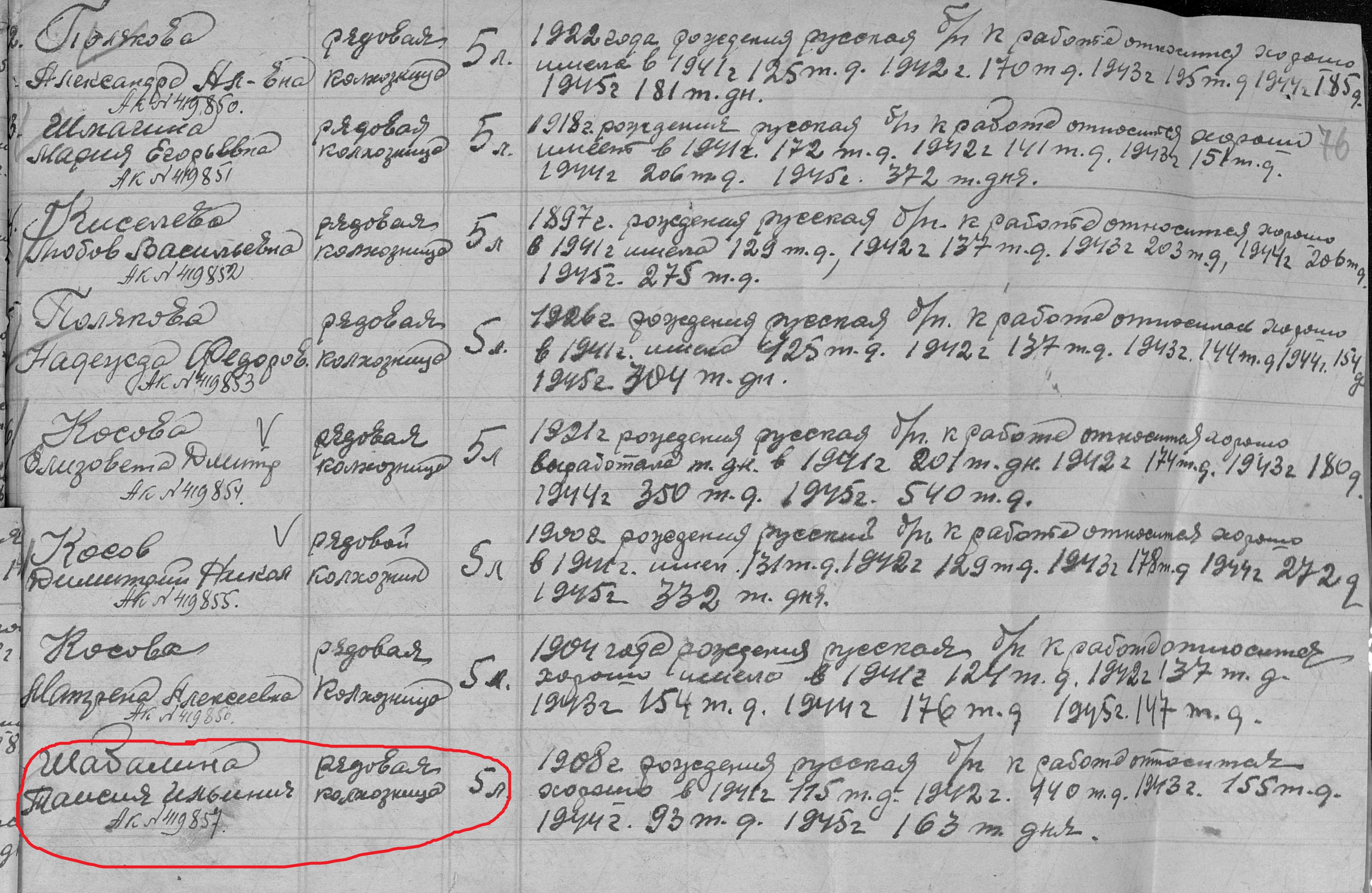 Шабалина Таисия Ильинична родилась в 1904 году. Место жительства: д.Дальняя Ивановка Ново-Шешминский район ТАССР (ныне Альметьевский район РТ). В годы Великой Отечественной войны работала в колхозе им.Буденого рядовой колхозницей. Награждена медалью "За доблестный труд в Великой Отечественной войне 1941–1945 гг." (Акт от 28 апреля 1947 г, фонд 3610, опись 2, дело № 325, лист 76, № 419857).