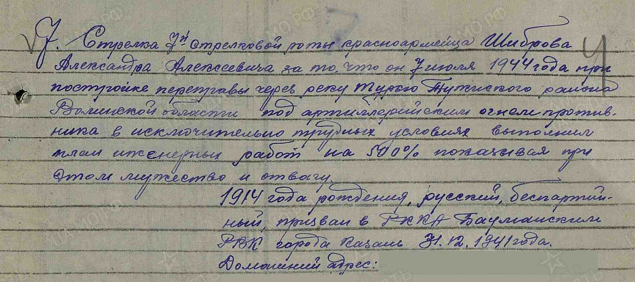 ШАБРОВ (ШИБРОВ) Александр Алексеевич, 1914, с. Алексеевское. Мобилизован Бауманским РВК г. Казань 31 окт. 1941. Воевал на Западном, 2 Прибалтийском, 1 Белорусском фронте в составе 20 А/ 29 А/ 5 А/ 10 гв. А/ 69 А. Красноармеец, стрелок 1081 СП 312 СД. Участник освобождения Смоленщины, Белоруссии, Украины, Польши. Проявил героизм при постройке переправы ч/з р. Турья, Волынская обл., УкрССР. Награждён медалью «За отвагу». Ошибочно учтён пропавшим без вести при форсировании р. Висла. Перенёс ранение. После госпиталя, 14 апр. 1945, направлен в Казанскую гарнизонную кузницу.