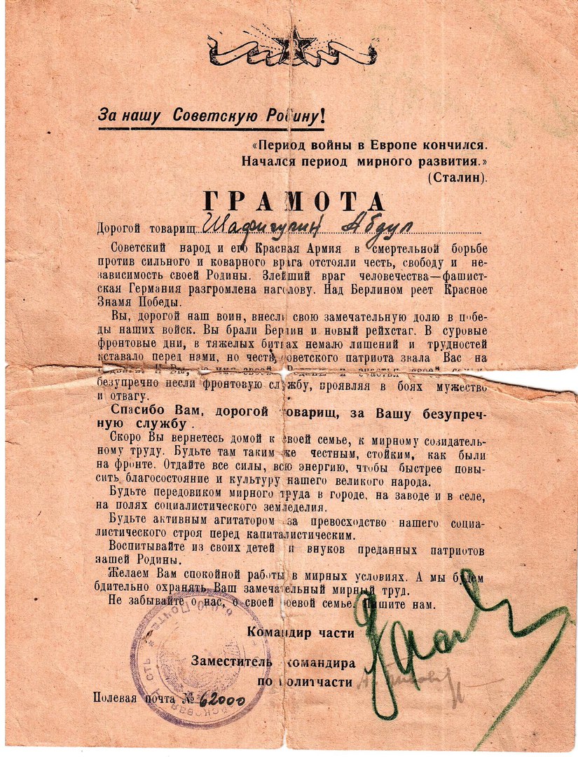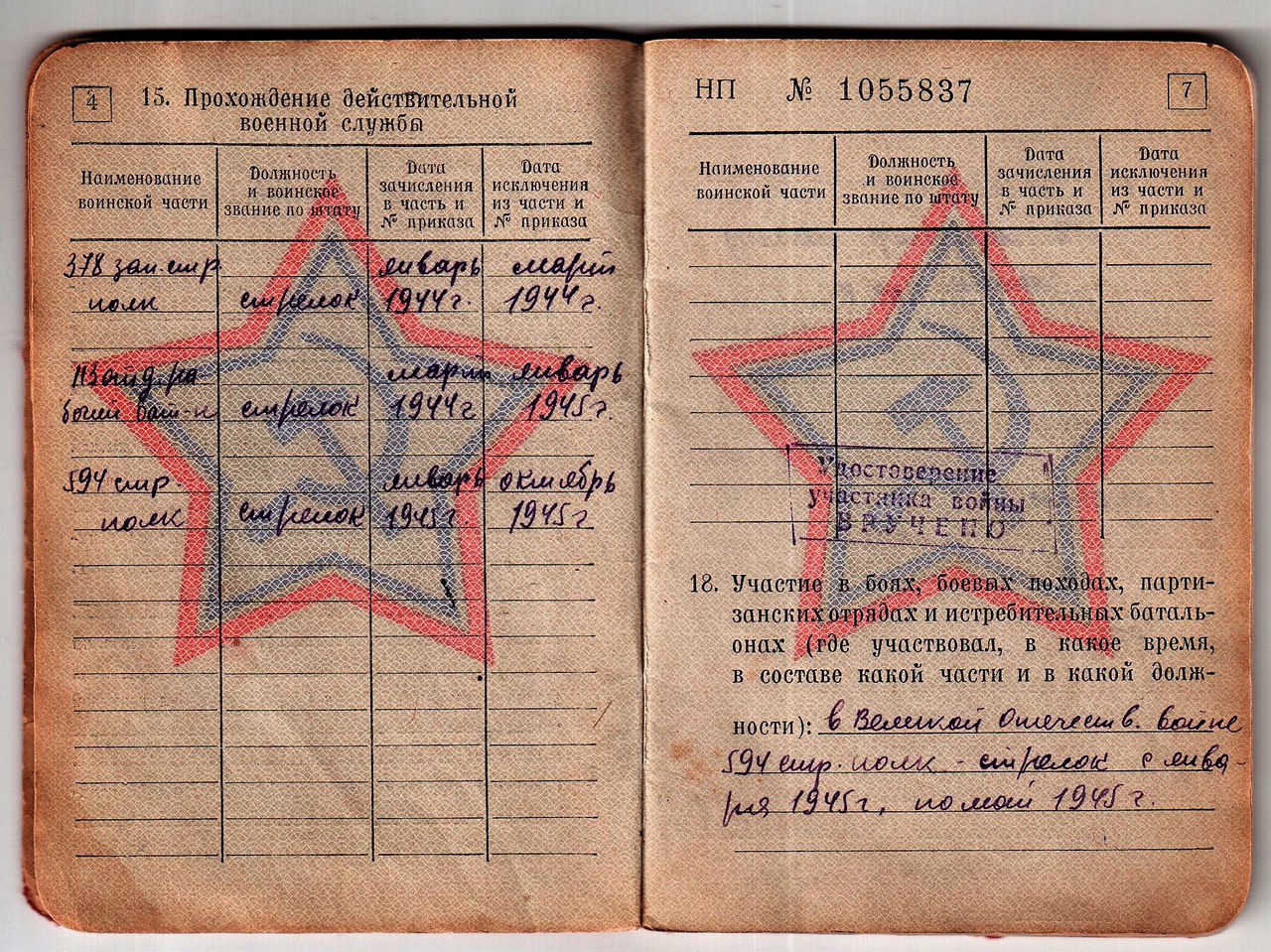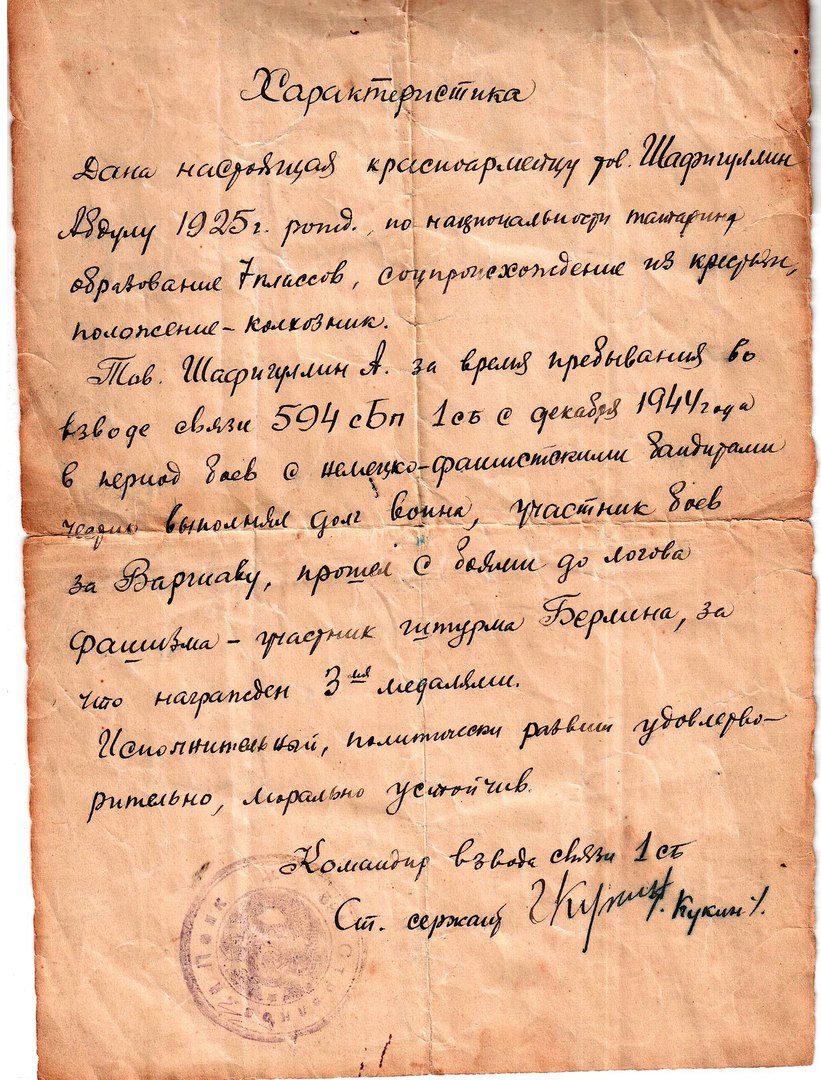 С 1944-1945 гг. служил стрелком в 378 зап.стрелковом полку, в 113 отделении рабочего батальона.
