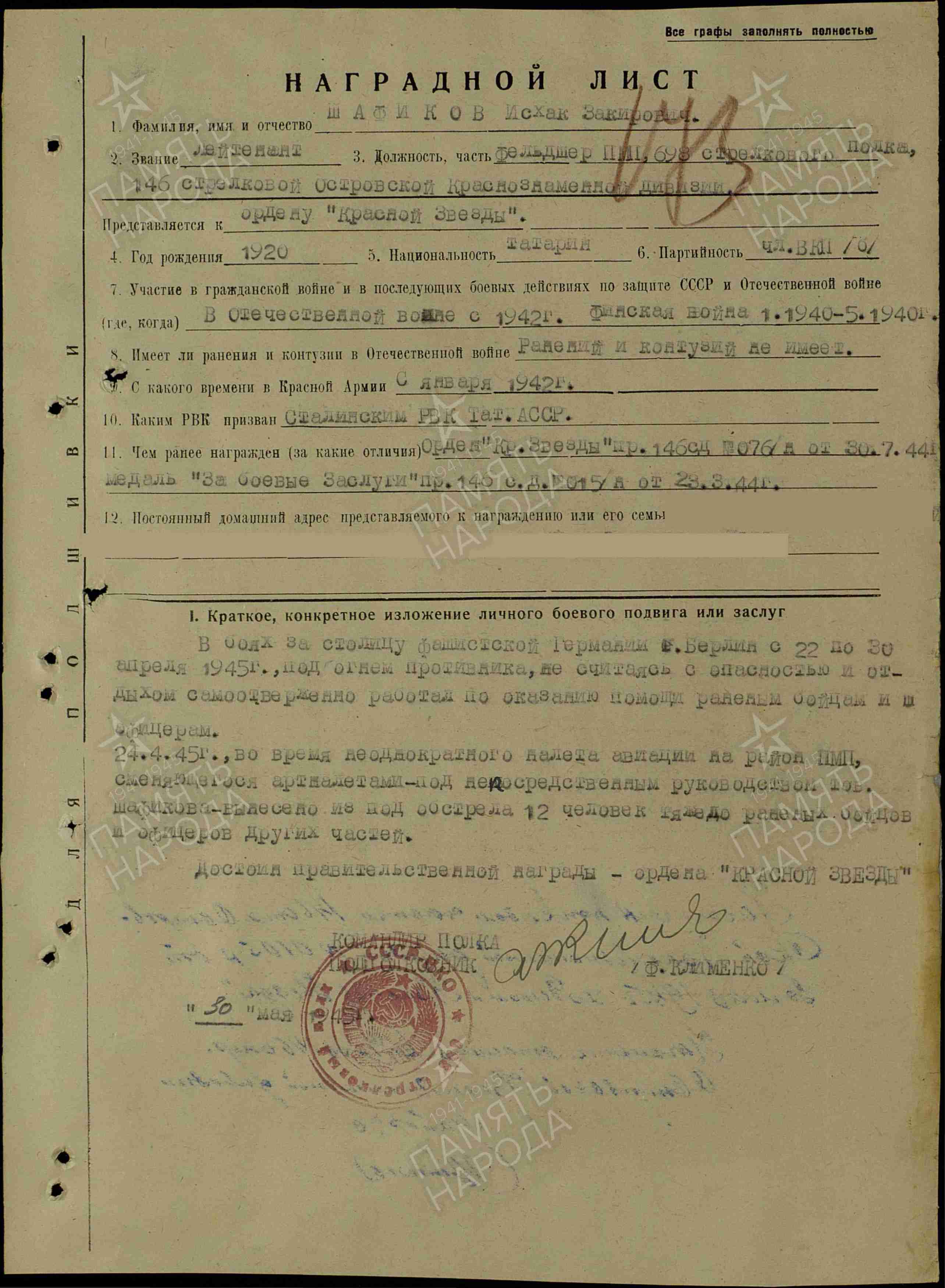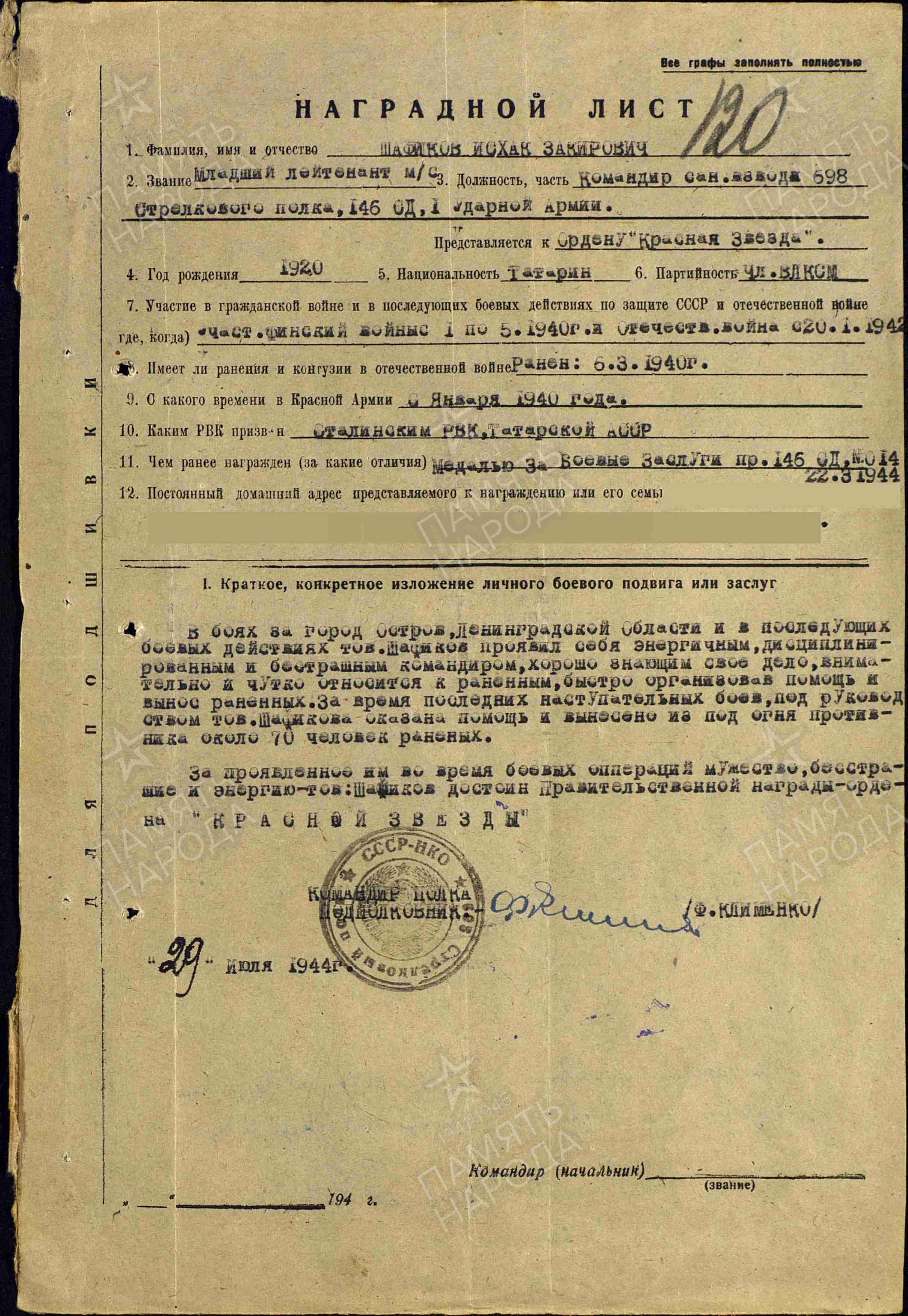 Исхак Закирович Шафиков родился в 1920 г. в д.Кулушкино Чистопольского района ТАССР. В 1940 г. призван в ряды Красной Армии Чистопольским районным военным комиссариатом, с 20 января 1942 г. участник Отечественной войны. Служил в звании фельдшера сан.роты 698 стрелкового полка, 146 стрелковой дивизии, 3-й Ударной армии. Был ранен 6 марта 1940 г.