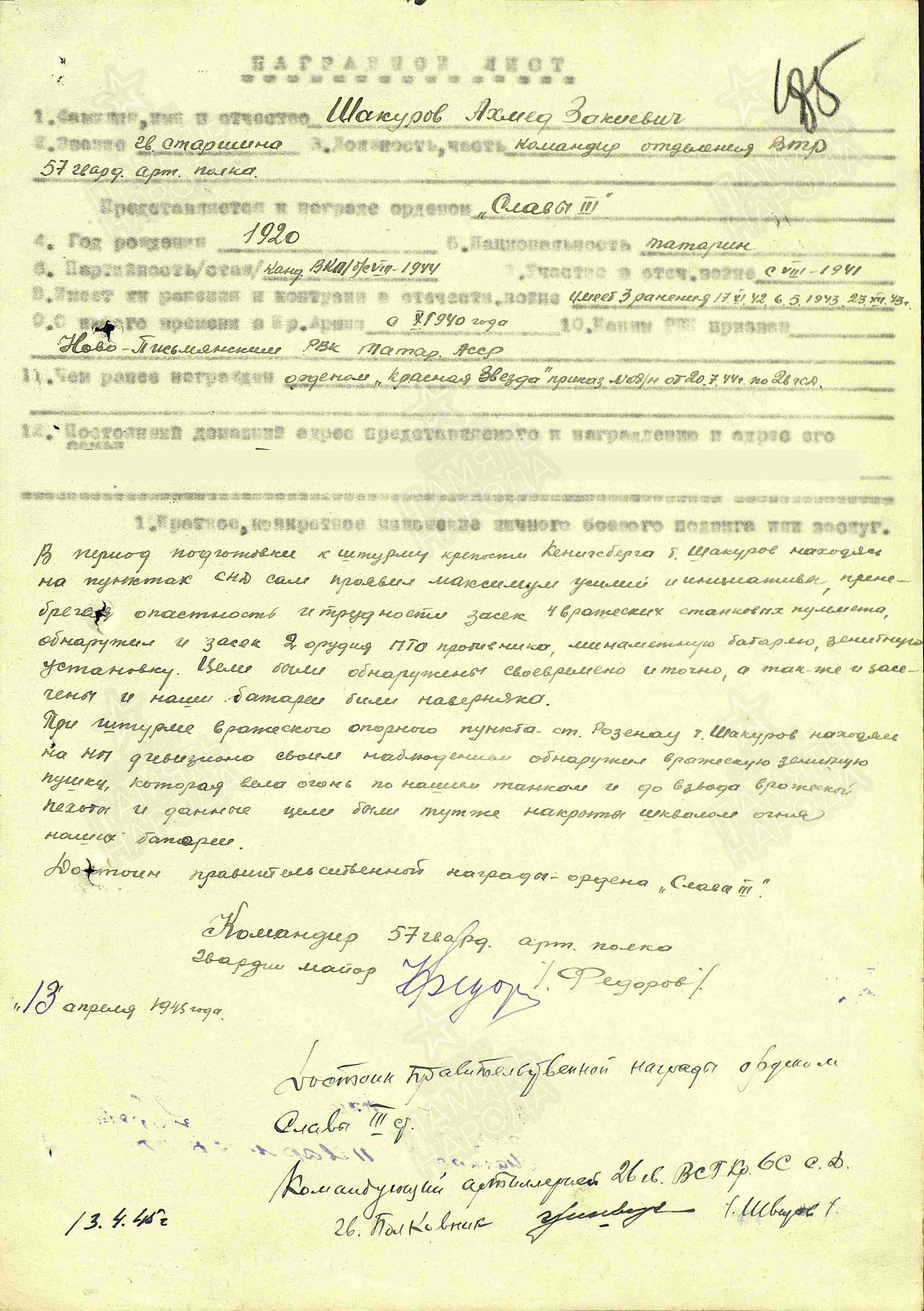 Призван Ново-Письмянским РВК, ТАССР. Воинское звание гв. старшина; рядовой. Воинская часть 57 гвардейский артиллерийский полк 26 гвардейской стрелковой дивизии; 1 стрелковая дивизия 290 отдельная штрафная рота.