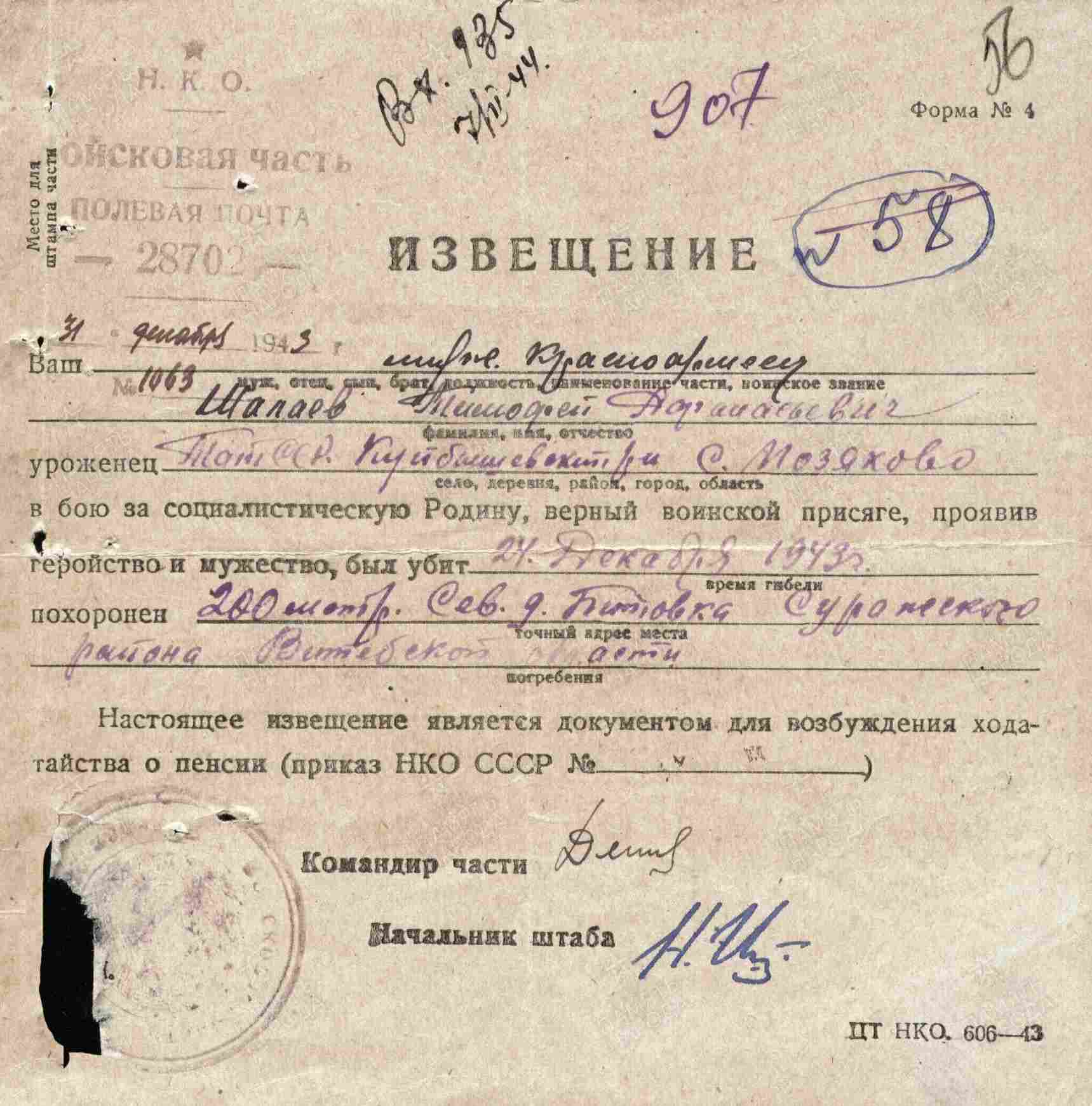 ШАЛАЕВ Тимофей Афанасьевич, 1902, с. Базяково. Мобилизован 18 авг. 1942 Ленинским РВК г. Казань. Красноармеец, 13 отд. ИПТДн/ 259 СП 179 СД 43 А Калининского фронта, 992 СП 306 СД 43 А 1 Прибалтийского фронта. Убит 24 дек. 1943, д. Битовка, Суражский р-н, Витебская обл., БелССР.