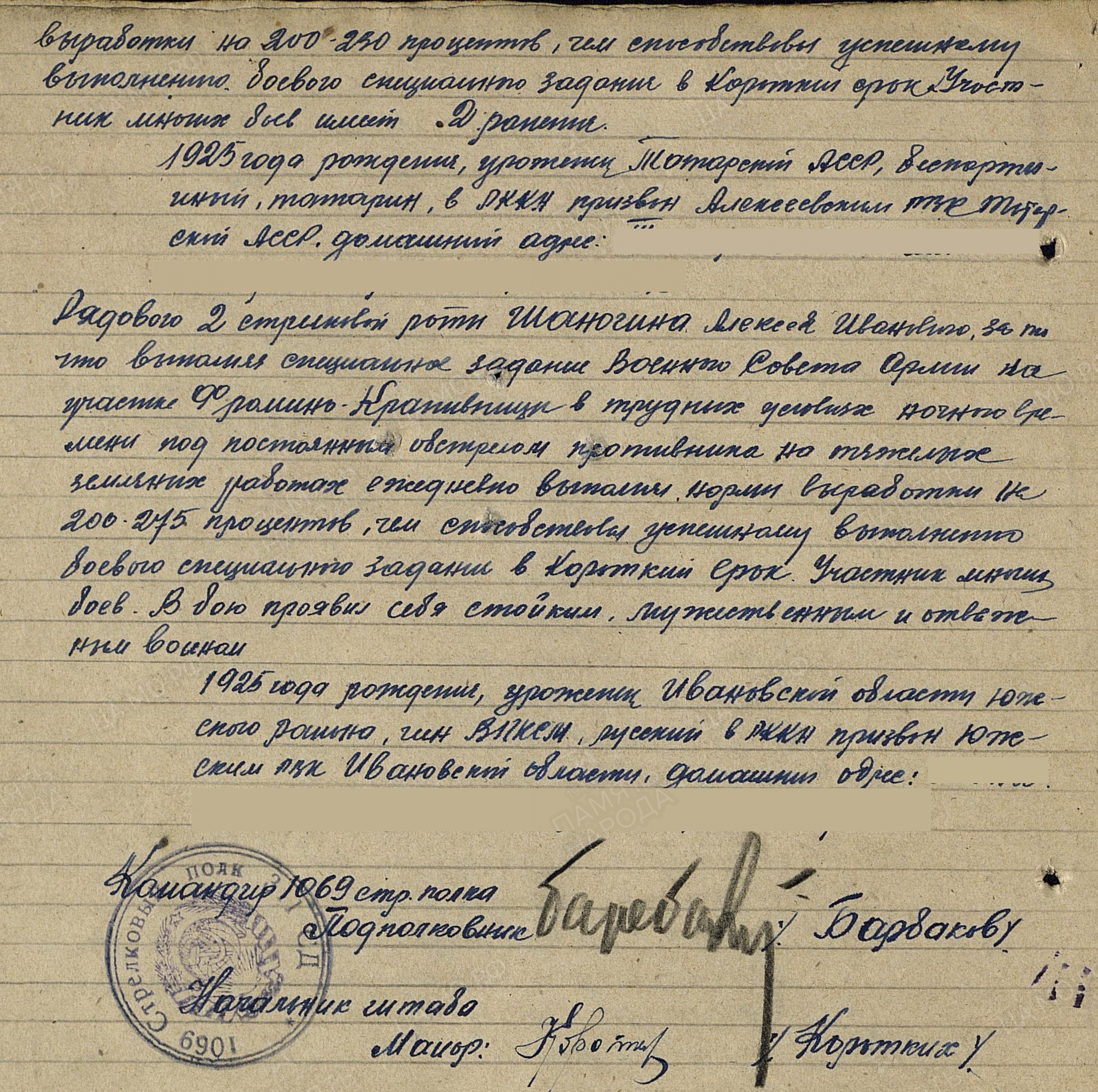 ШАМАЕВ Хади Файзуллович, 1925, с. Ср. Тиганы. Мобилизован Алексеевским РВК 24 янв. 1943. В боях с янв. 1944. Мл. сержант, ком. отделения пульроты 1059 СП 311 СД ВолхФ, 99 СК 54 А ЛенФ, 1 ПрибФ. Дважды ранен. Награждён медалью "За отвагу", орденами Славы 3 ст. (в боях за город-крепость Двинск вместе с отделением уничтожил четыре пулемётные точки противника с расчётами и рассеял до роты солдат), Отечественной войны 2 ст. (1985).