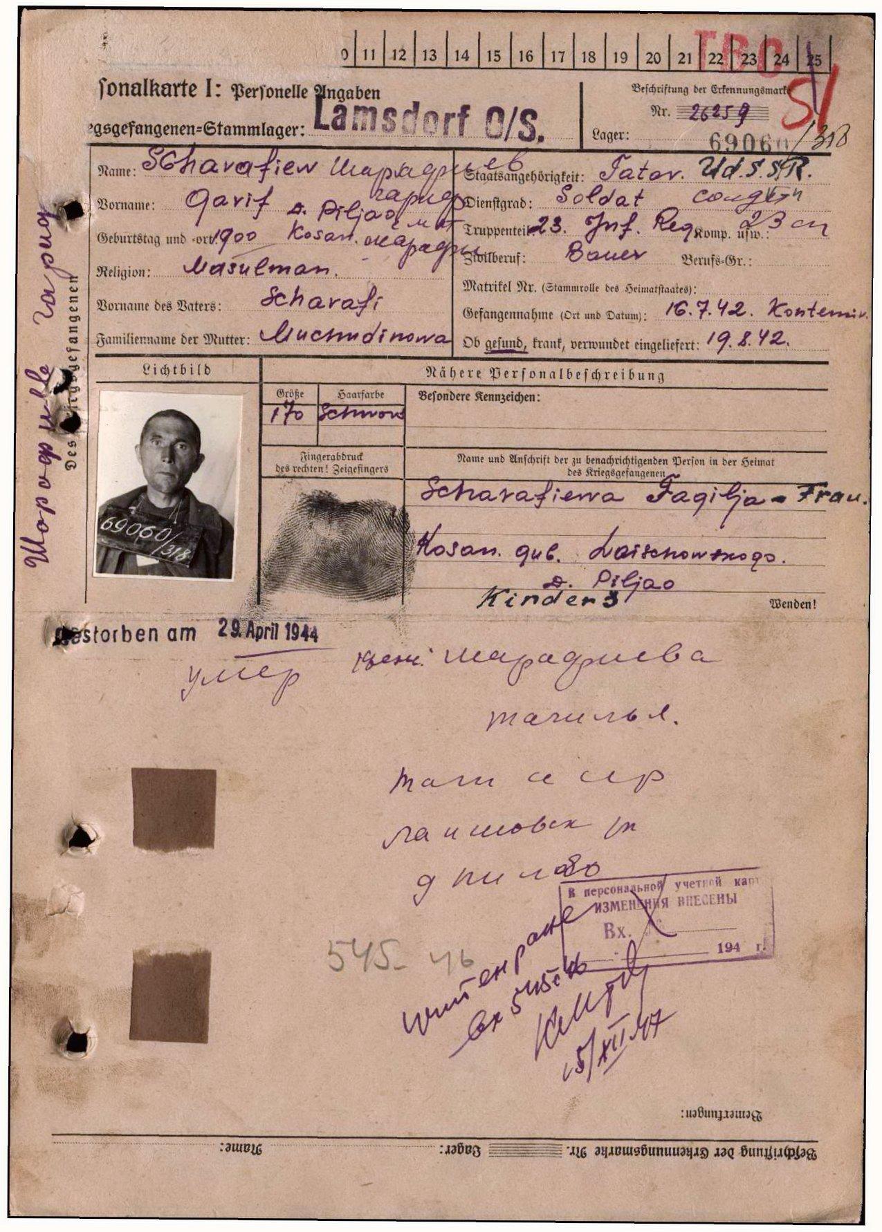 Родился в 1900 г. в с. Пелёво Лаишевского уезда. До войны имел 3-х детей. Мобилизован Лаишевским РВК. Красноармеец 23 стр. полка (бригады?). Попал в плен 16 июля 1942 г. под Кантемировкой. Содержался в лагере военнопленных № 318 Ламсдорф (Ламбиновице, Польша). Умер 29 апреля 1944 г. Семья: жена Шарафиева Фагиля, с. Пелёво, Лаишевский р-н ТатАССР.