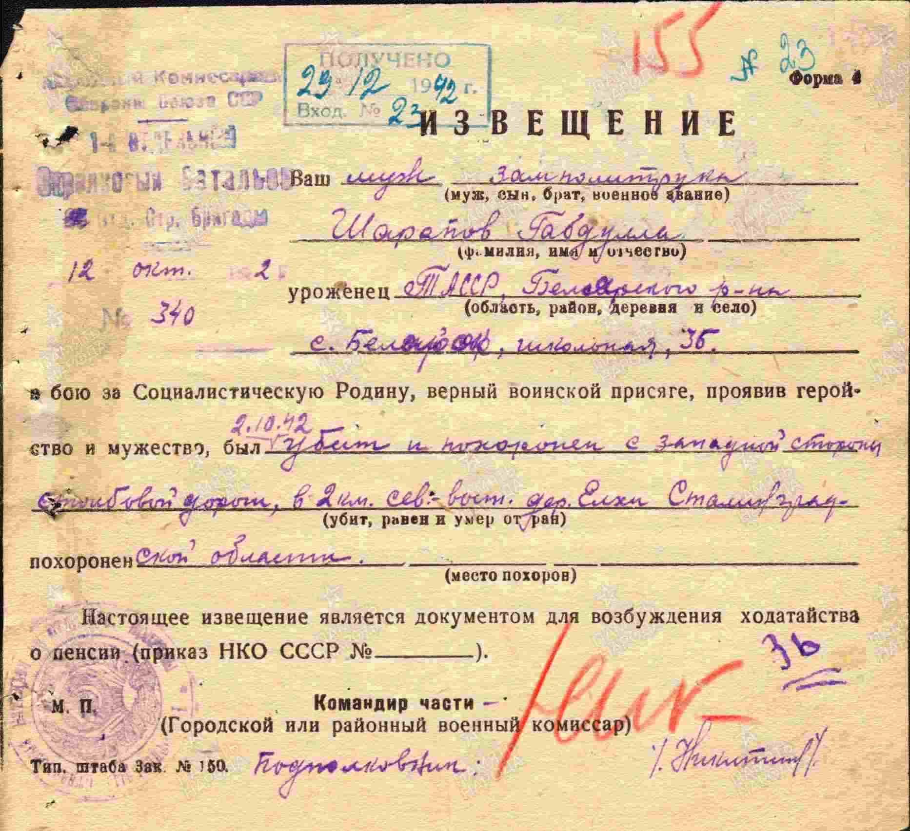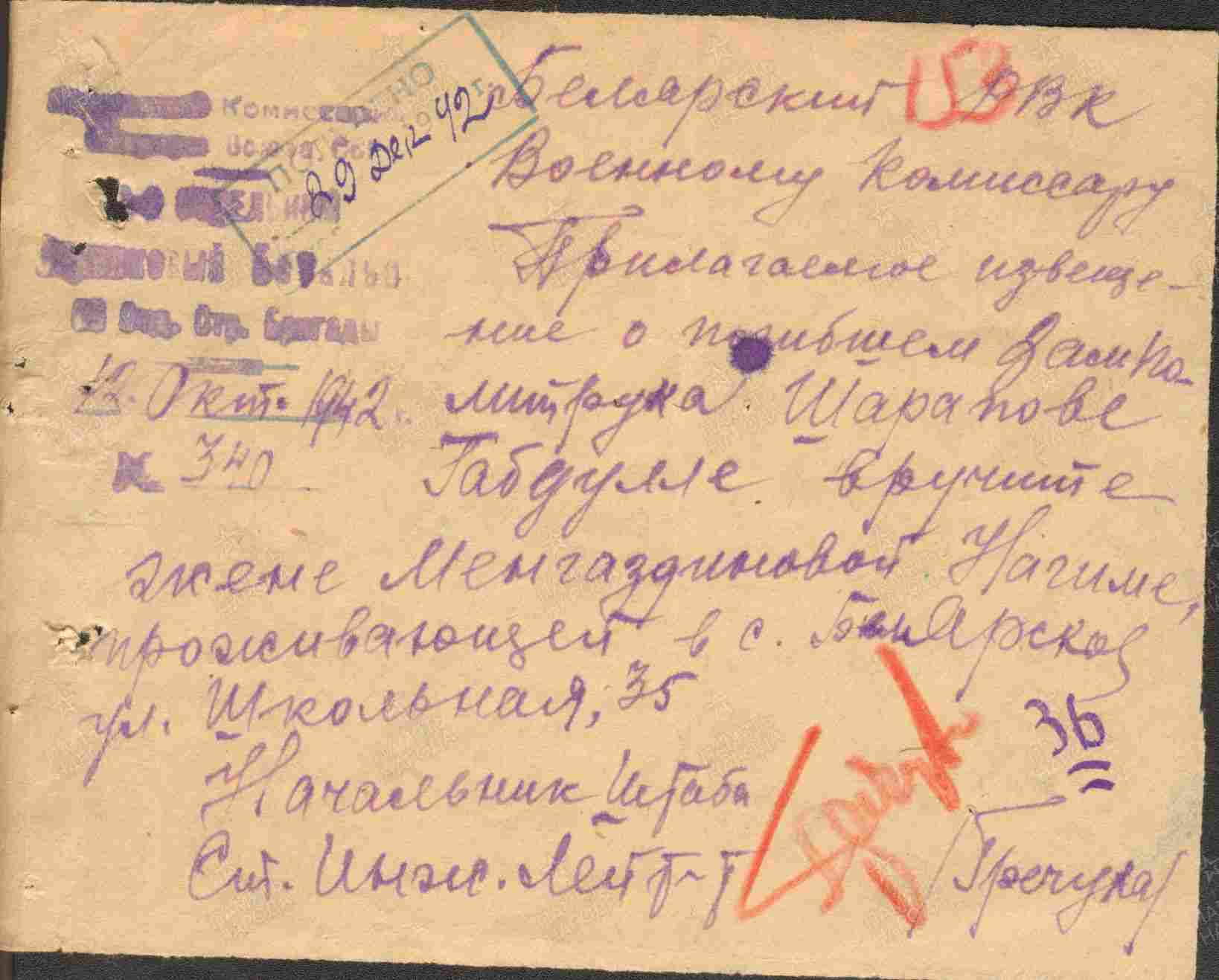 ШАРАПОВ Габдулла Мингазентдинович, 1905, с. Кульбаево-Мараса. Проживал в с. Билярск. Член ВКП(б). Мобилизован 1 нояб. 1941 Билярским РВК. Зам. политрука роты/ батальона 66 отд. (морской) СБр 32 А Карельского фронта, 47 А Северо-Кавказского фронта, 64 А Сталинградского фронта. Убит 2 окт. 1942, хут. Елхи, Бекетовский (Кировский) р-н, Сталинградская обл.