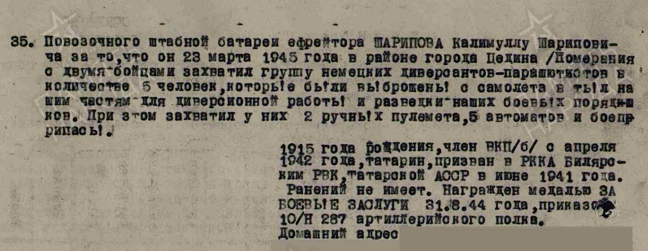 ШАРИПОВ Калимулла Шарипович, 1915, с. Ошняк. Мобилизован 28 июня/ 1 июля 1941 Билярским РВК. Воевал с марта 1942 на Брянском, Центральном, 1 Украинском, 2 и 1 Белорусском фронте в составе 13 А/ 48 А/ 60 А/ 47 А. Член ВКП(б). Красноармеец/ ефрейтор, повозочный штабной батареи/ повар батареи 287 АП 143 СД. Участник битвы на Курской дуге, форсирования Днепра, освобождения Украины, Белоруссии, Польши, штурма Берлина. Награждён медалями «За боевые заслуги», «За отвагу», «За освобождение Варшавы», «За взятие Берлина». После войны жил в г. Казань.