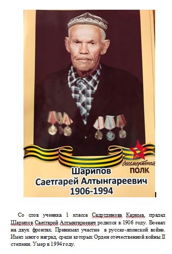 Шарипов Саетгарей Алтынгареевич (1906 - 1994г.г.). Воевал на двух фронтах. Принимал участие в русско - японской войне. Имел много наград, среди которых Орден Отечественной войны 2 степени.